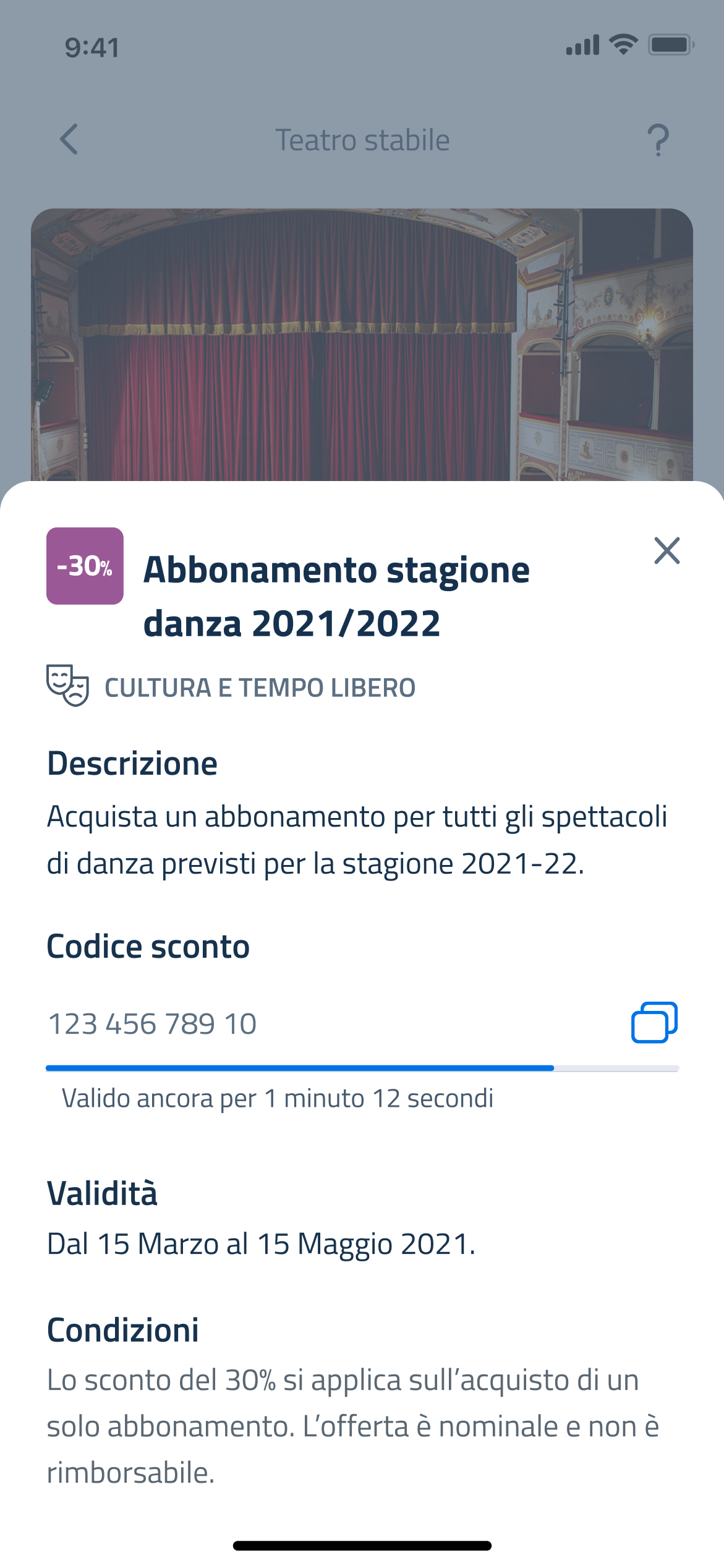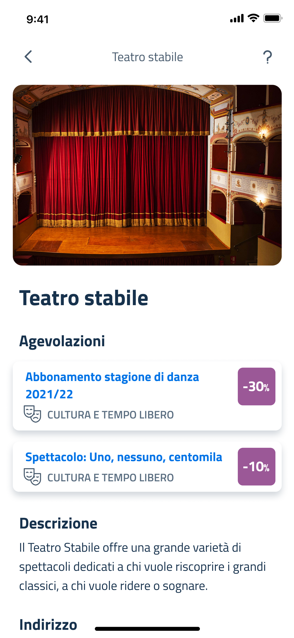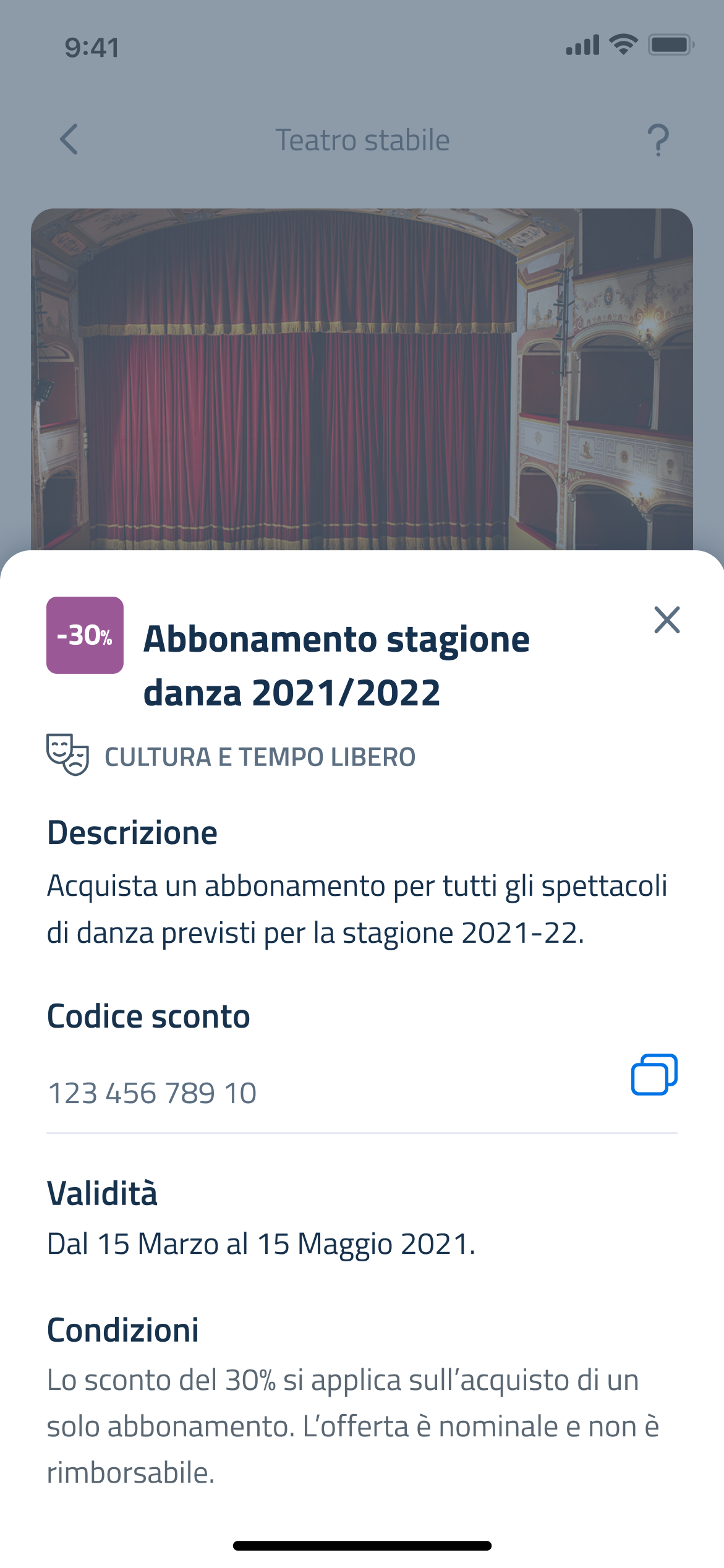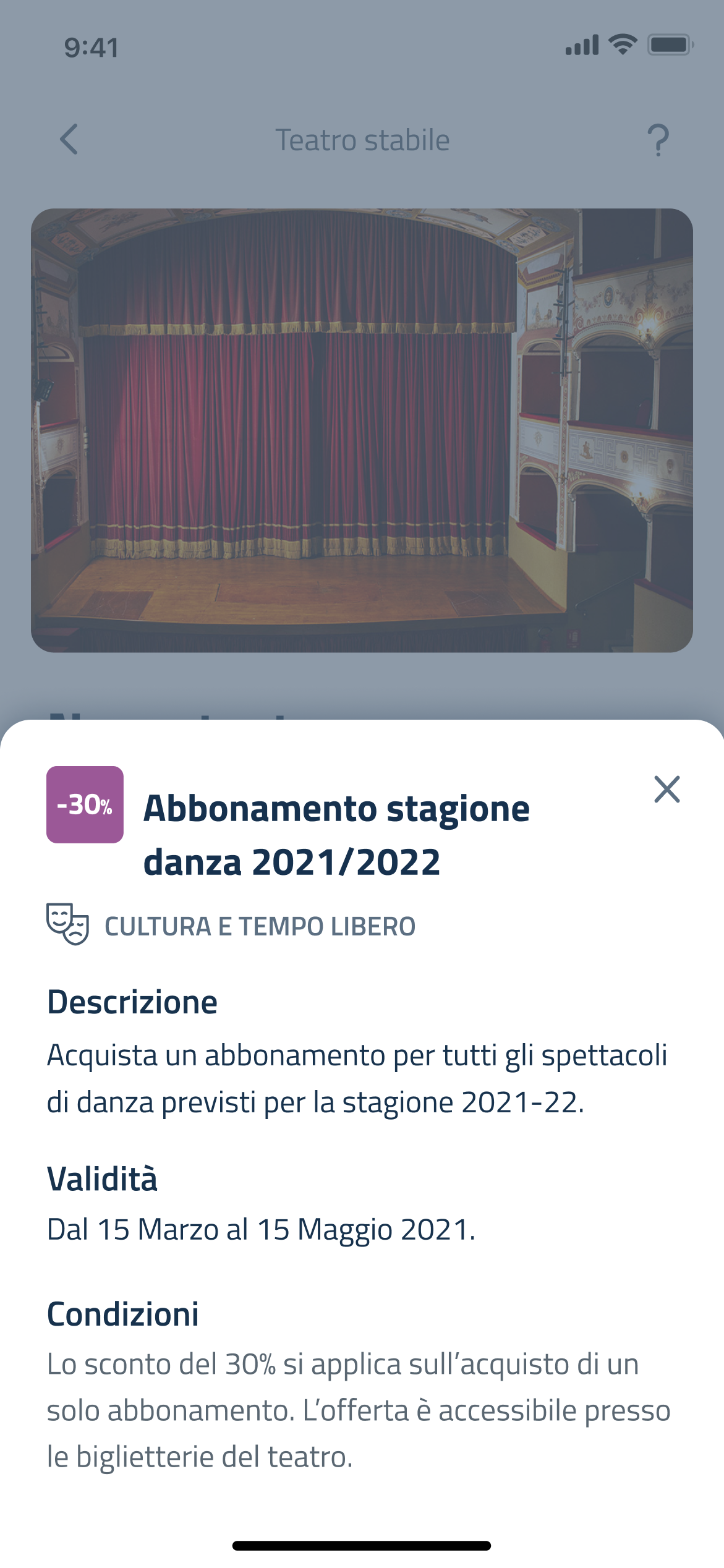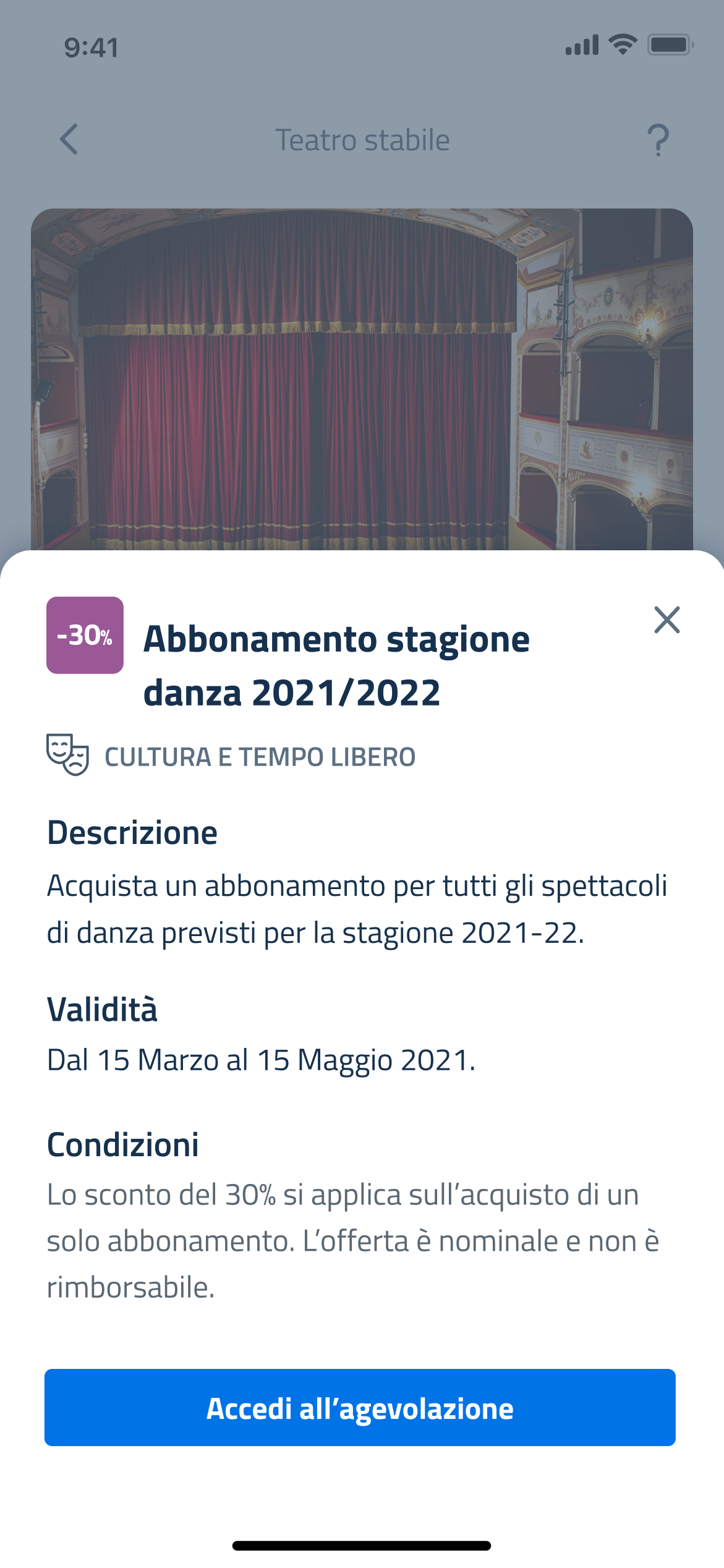 Toccando un’agevolazione si apre un bottom sheet che ne presenta i dettagli:
