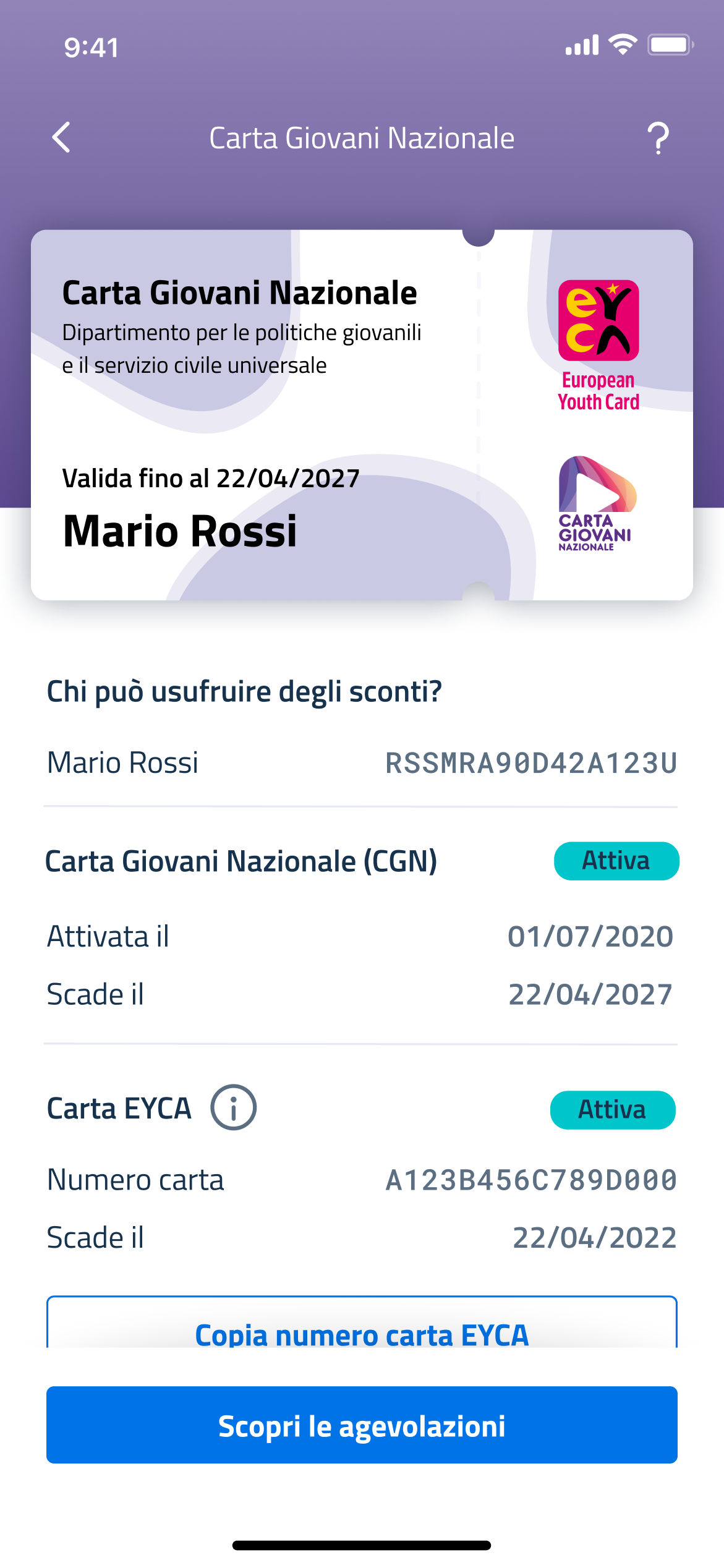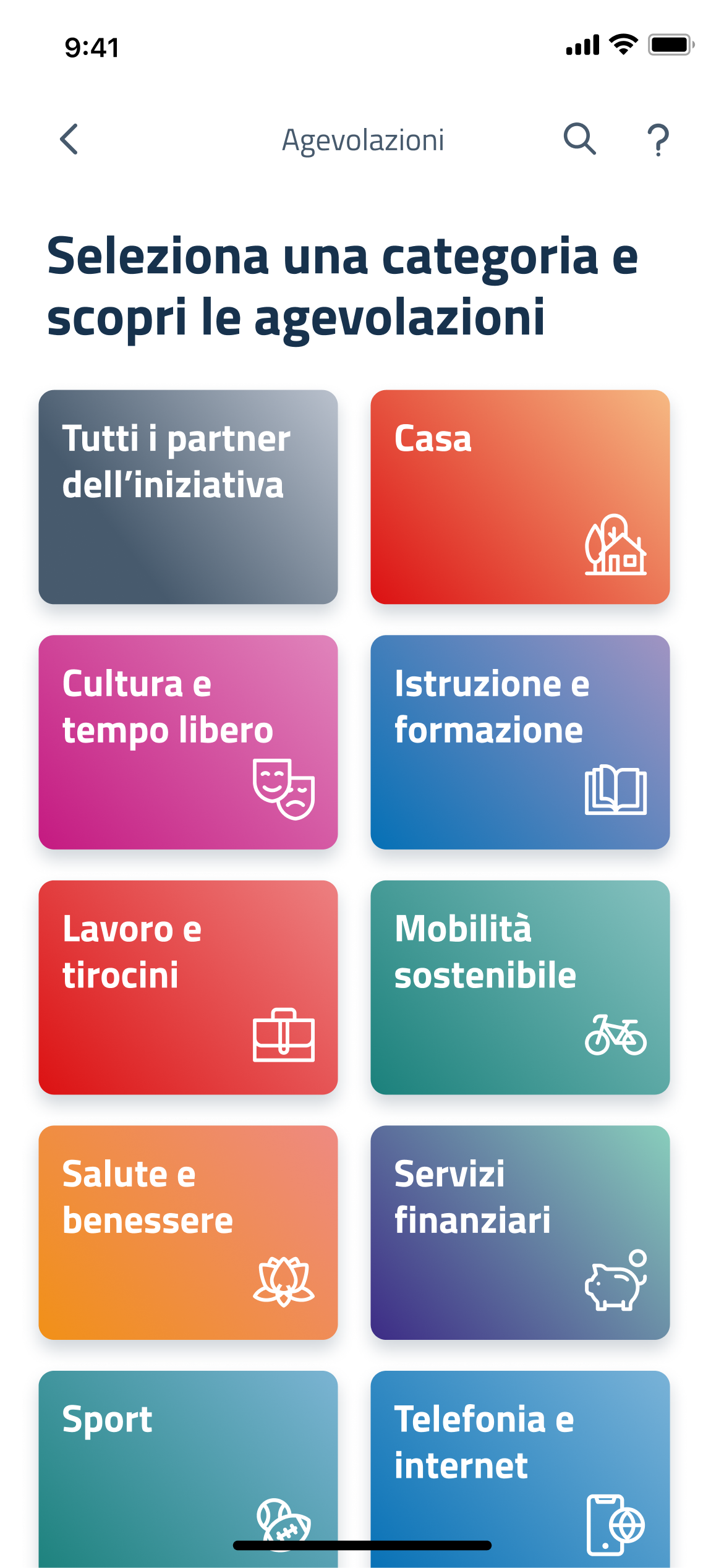 Il giovane tocca Scopri le agevolazioni e atterra su una schermata di presentazione delle categorie merceologiche delle agevolazioni offerte dai partner dell'iniziativa.