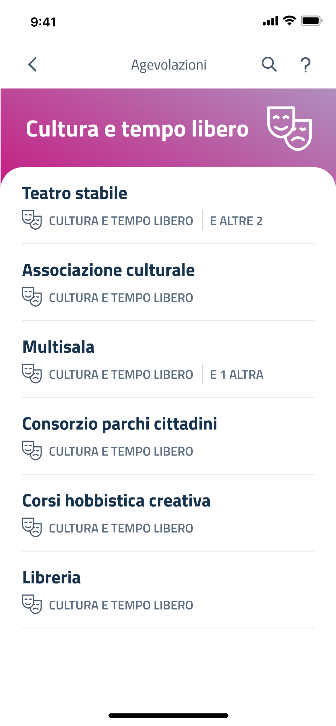 Premendo una categoria, il Beneficiario atterra su una schermata di lista in cui sono visibili tutti gli Operatori aderenti all’iniziativa, che hanno almeno un’agevolazione in corso di validità appartenente alla categoria selezionata. Premendo Tutti i partner dell'iniziativa, vengono visualizzati tutti gli Operatori in ordine alfabetico, che hanno almeno un'agevolazione pubblicata in quel momento.
