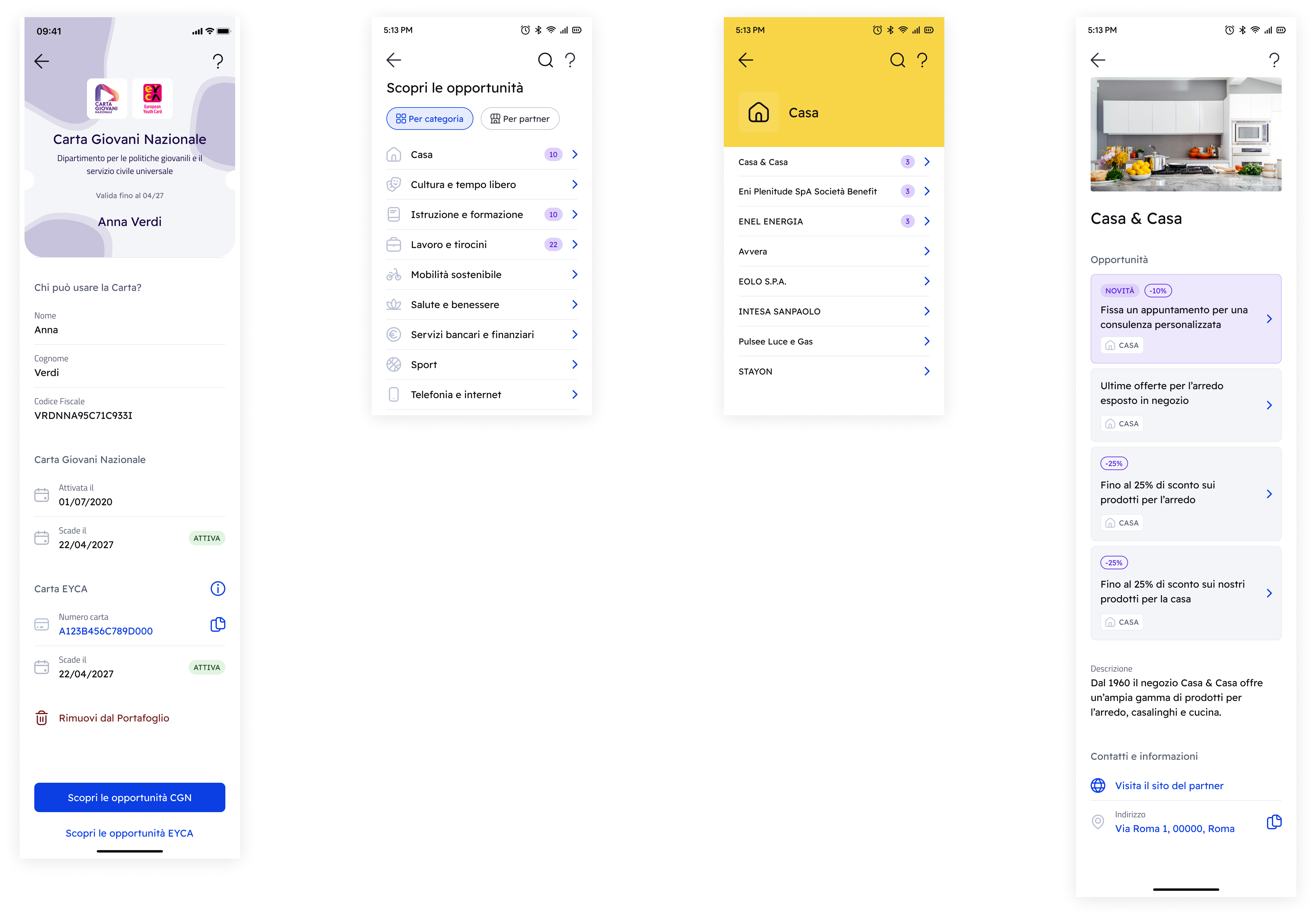 Il giovane beneficiario della CGN, che intende accedere alla lista delle opportunità accede alla sezione CGN della App IO, tocca "Scopri le opportunità" e atterra su una schermata di presentazione delle categorie merceologiche delle opportunità offerte dai partner (Operatori) dell'iniziativa (tab "Per categoria")
