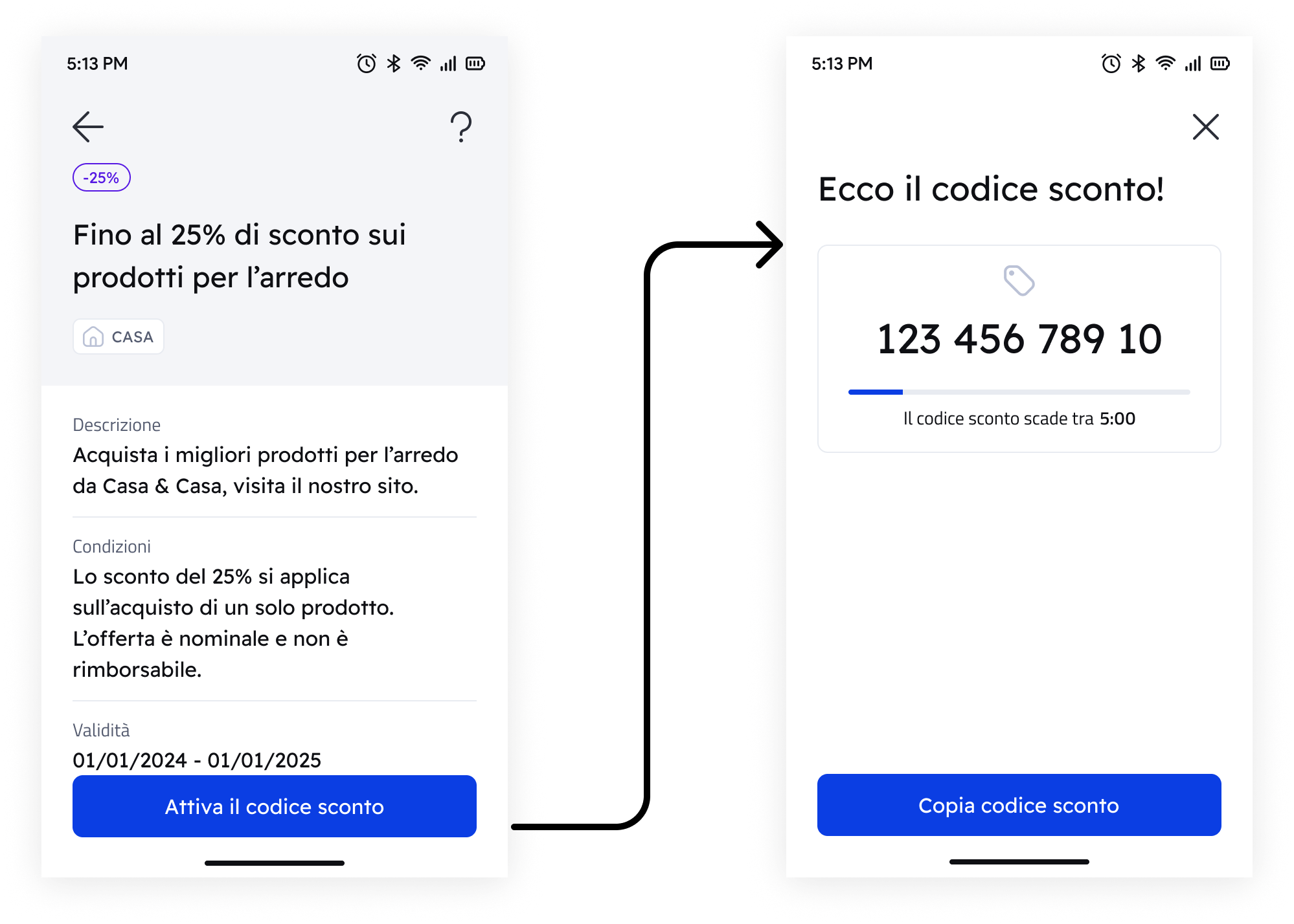 • Al momento dell’acquisto, il Beneficiario accede alla sua CGN sull’App IO, apre la schermata relativa all’opportunità e genera un codice sconto temporaneo (OTP) per quella opportunità, della durata di 10 minuti o fino a completamento della transazione, se più breve;