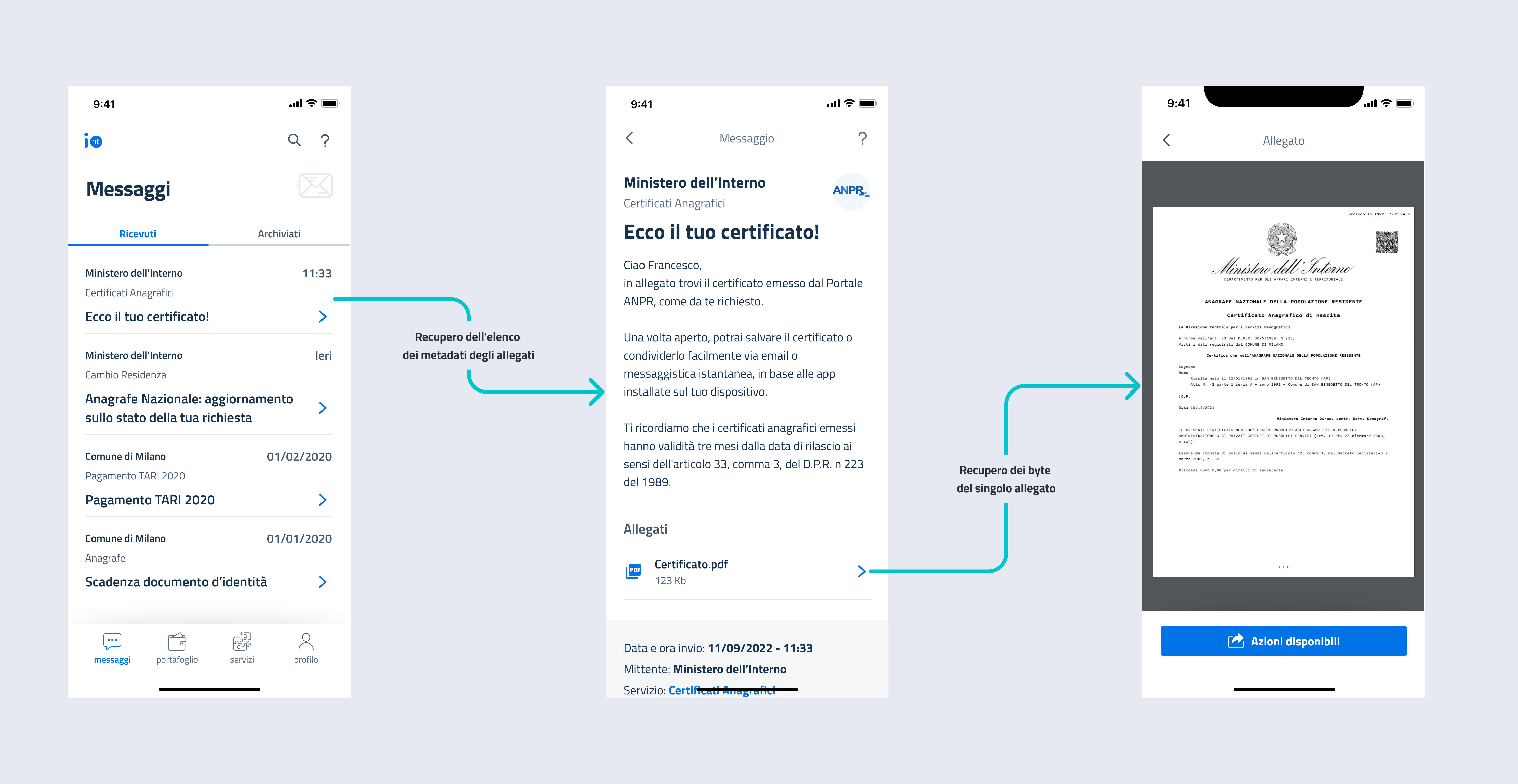 Gli enti che hanno sottoscritto il programma Premium possono includere allegati nei messaggi che inviano. Questi allegati vengono recuperati dai sistemi dell'ente mittente nel momento in cui vengono aperti dall'utente.