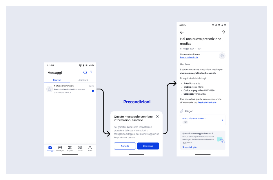 Le precondizioni sono una schermata intermedia tra l'elenco dei messaggi e il dettaglio del messaggio selezionato. L’utente accede al dettaglio del messaggio solo se seleziona il bottone "Continua".