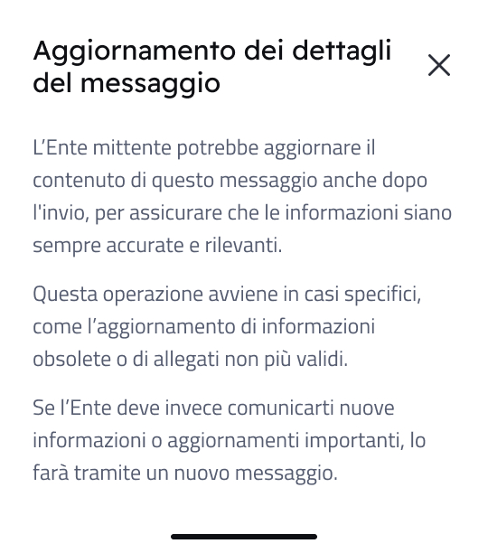 Questo significa che il destinatario potrebbe vedere testi differenti nel dettaglio del messaggio e fuori. Consigliamo di non differenziare il titolo in modo sostanziale, in modo da mantenere la coerenza informativa tra i due testi. Inoltre, ti ricordiamo che ai sensi delle Linee Guida IO, non è possibile inserire informazioni sensibili nel titolo del messaggio.