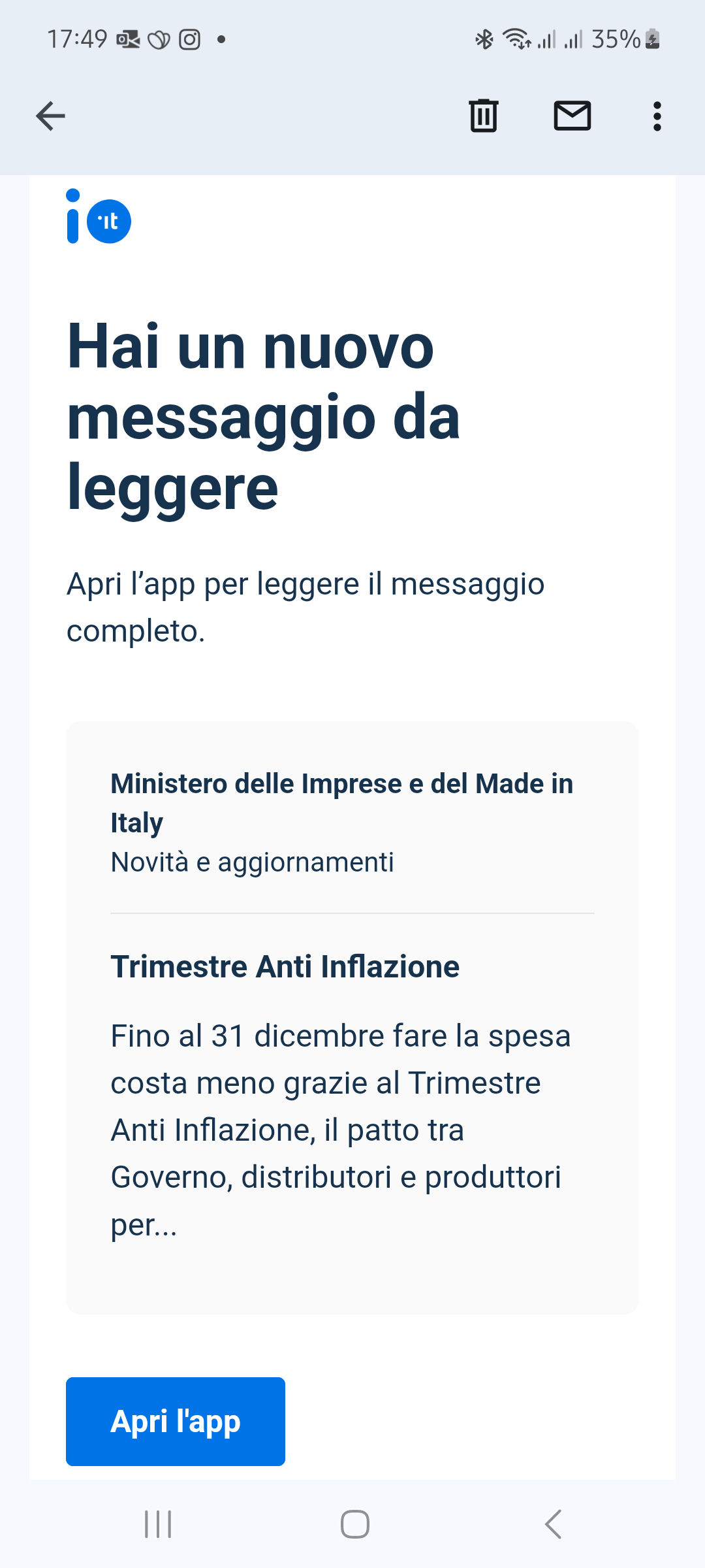 Nota sull'inoltro dei messaggi via email: Se abilitato dall'utente finale, un messaggio inviato tramite IO può essere inoltrato al suo indirizzo email. L'email contiene l'incipit del corpo del messaggio (i primi 134 caratteri), nonché un invito ad aprire l'app per accedere al contenuto completo tramite CTA che consente il redirect. Ecco un esempio di email di inoltro: