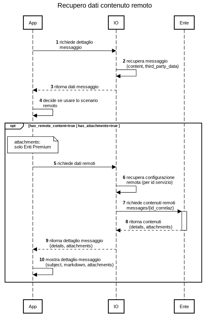 Se in fase di Creazione del messaggio con contenuto remoto avevi incluso il flag Has_remote_content o, essendo un Ente Premium, il flag Has_attachments, IO dovrà recuperare il contenuto del messaggio dai tuoi sistemi al momento della sua visualizzazione in app, e userà l'API di tipo GET con i seguenti parametri: