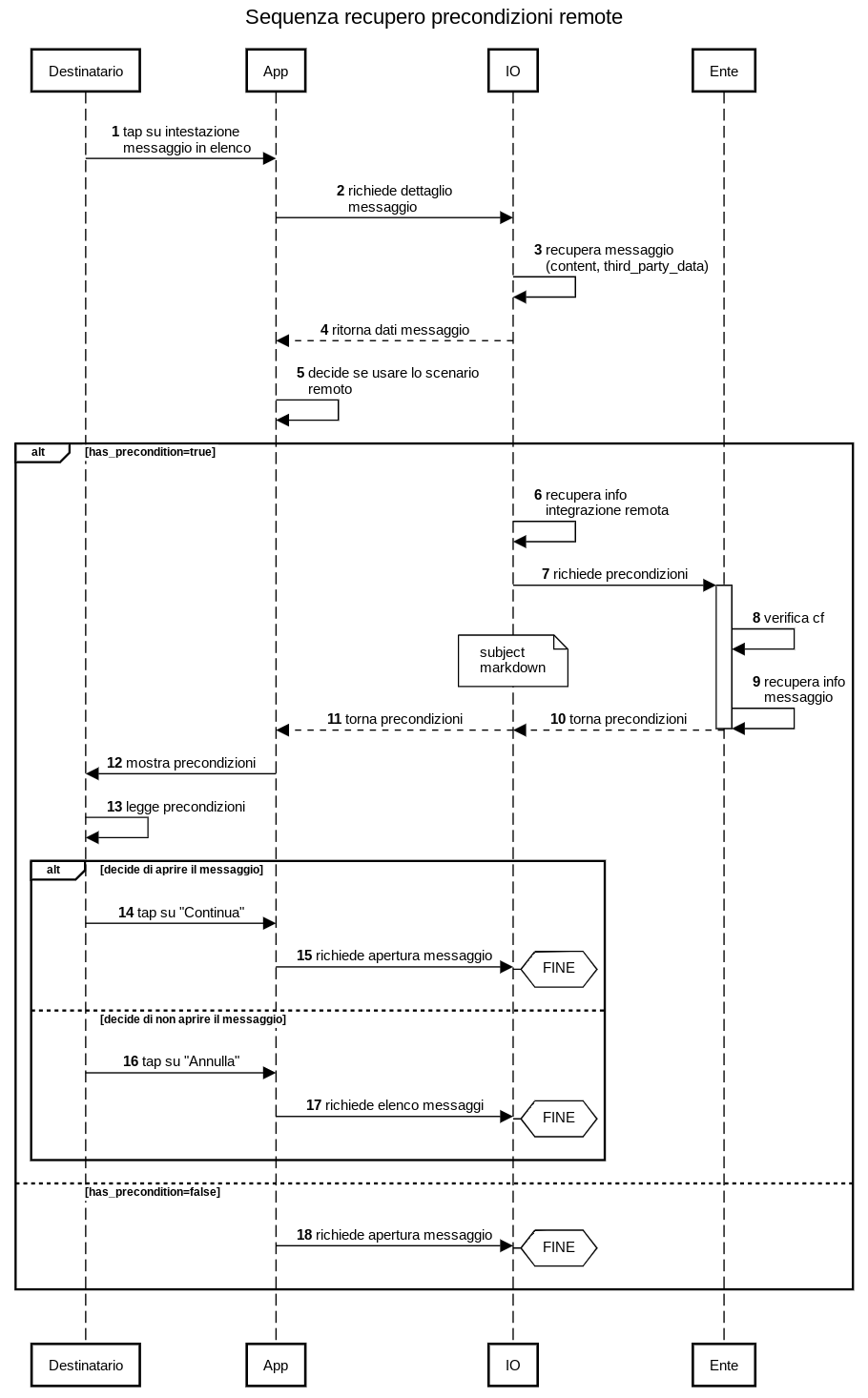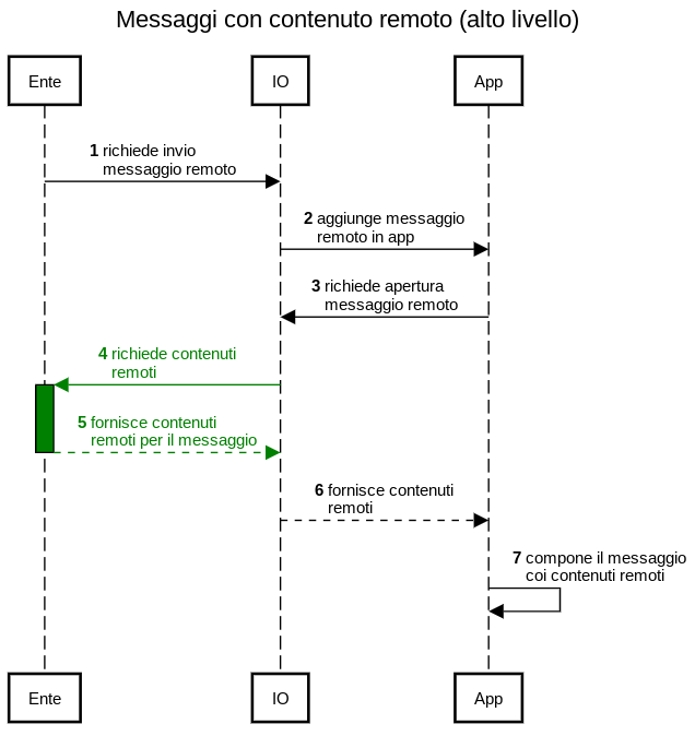 Nel diagramma che segue ti mostriamo la sequenza di eventi che vede coinvolti il suo sistema e quello di IO nello scambio di informazioni col destinatario di un messaggio a contenuto remoto: