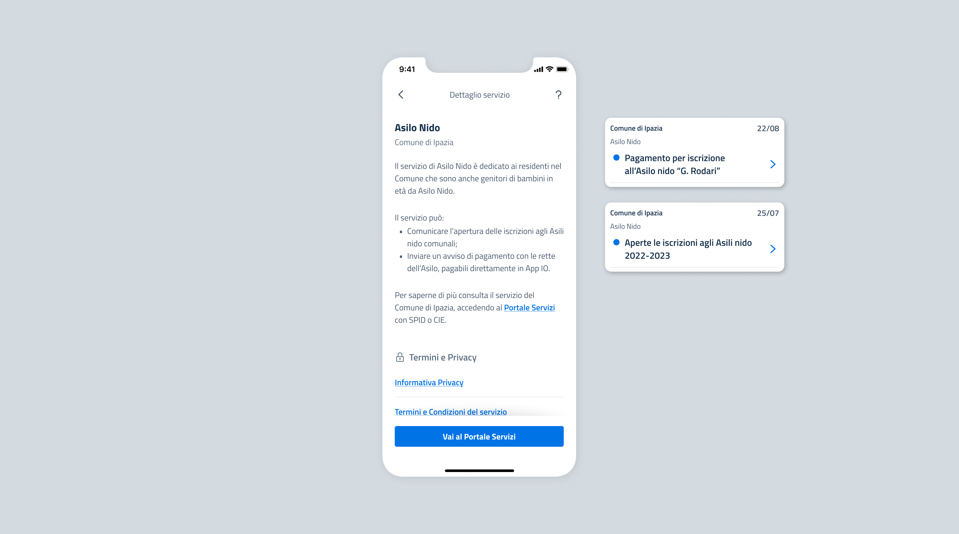 Il Comune di Ipazia crea due servizi, chiamati "Iscrizione asilo nido" e "Pagamento iscrizione asilo nido".