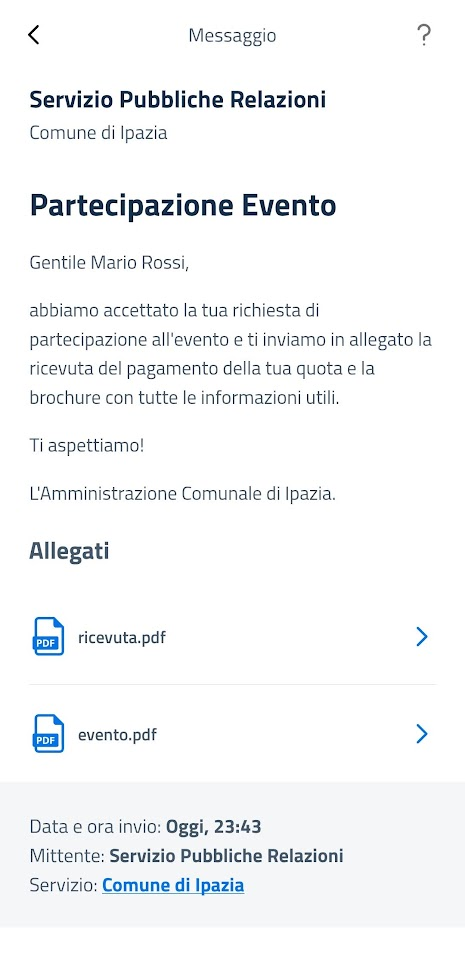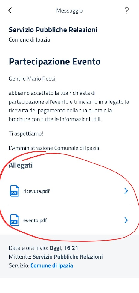 Toccando uno dei file allegati al tuo Messaggio, il destinatario avvierà il processo per cui IO richiederà alla tua Organizzazione i byte del file corrispondente utilizzando l'apposito endpoint che avrai esposto (Esposizione callback).