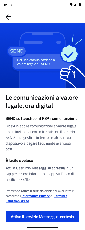 - É importante veicolare correttamente il messaggio che l'utente, una volta attivato il servizio, riceverà semplicemente degli avvisi o appunto dei messaggi di cortesia. L'utente infatti NON riceverà direttamente la comunicazione a valore legale. Quest'ultima sarà visibile solo su SEND.