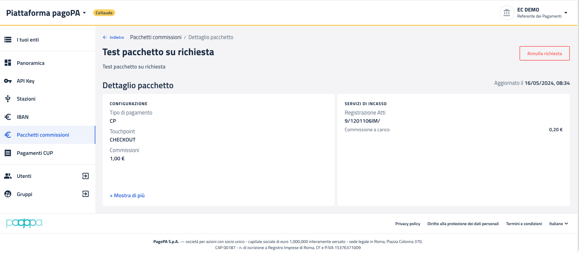 Dopo aver inviato una richiesta di attivazione pacchetto al PSP (vedi sezione Attiva pacchetto), accedendo al dettaglio del pacchetto (vedi sezione Visualizza dettaglio) è possibile annullare la richiesta appena effettuata solo nel caso in cui non sia stata ancora accettata da parte del PSP.
