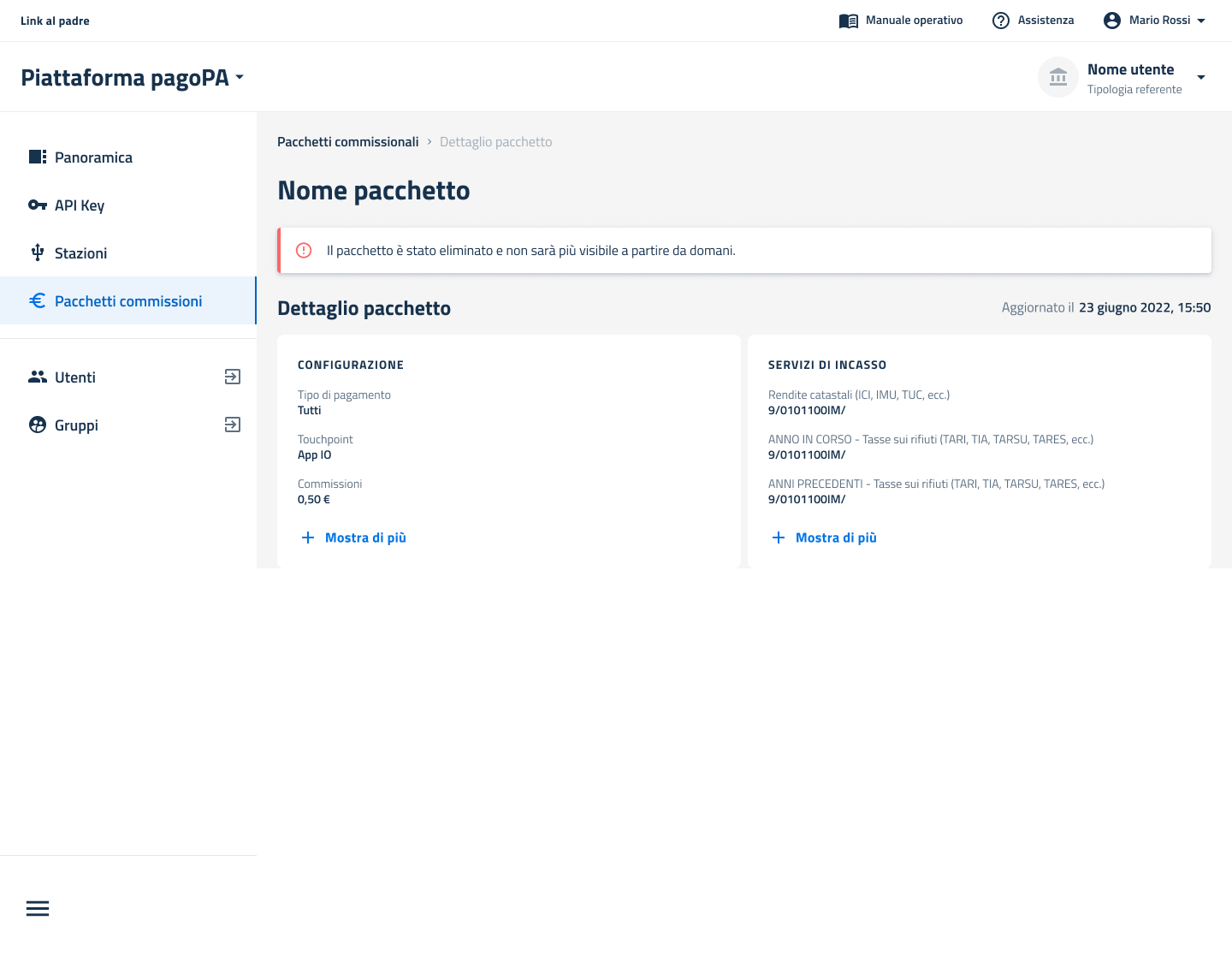 Un PSP può decidere di eliminare un determinato pacchetto "Su invito" per un EC, ed in questo caso il pacchetto compare nella lista dei pacchetti "Su invito" disponibili (vedi sezione Visualizzazione pacchetti "Su invito") nello stato "In eliminazione".