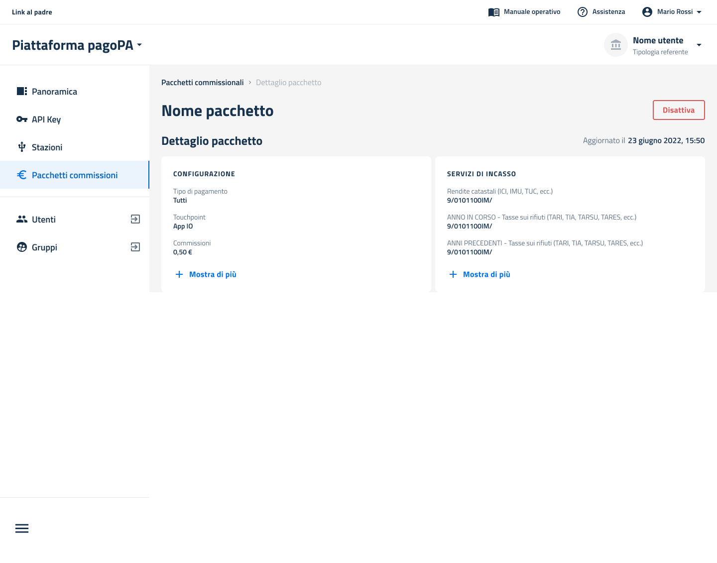 Una volta che la richiesta di attivazione è stata accettata da parte del PSP (vedi sezione Attiva pacchetto), è possibile disattivare l'adesione al pacchetto entrando nel dettaglio (vedi sezione Visualizza dettaglio).