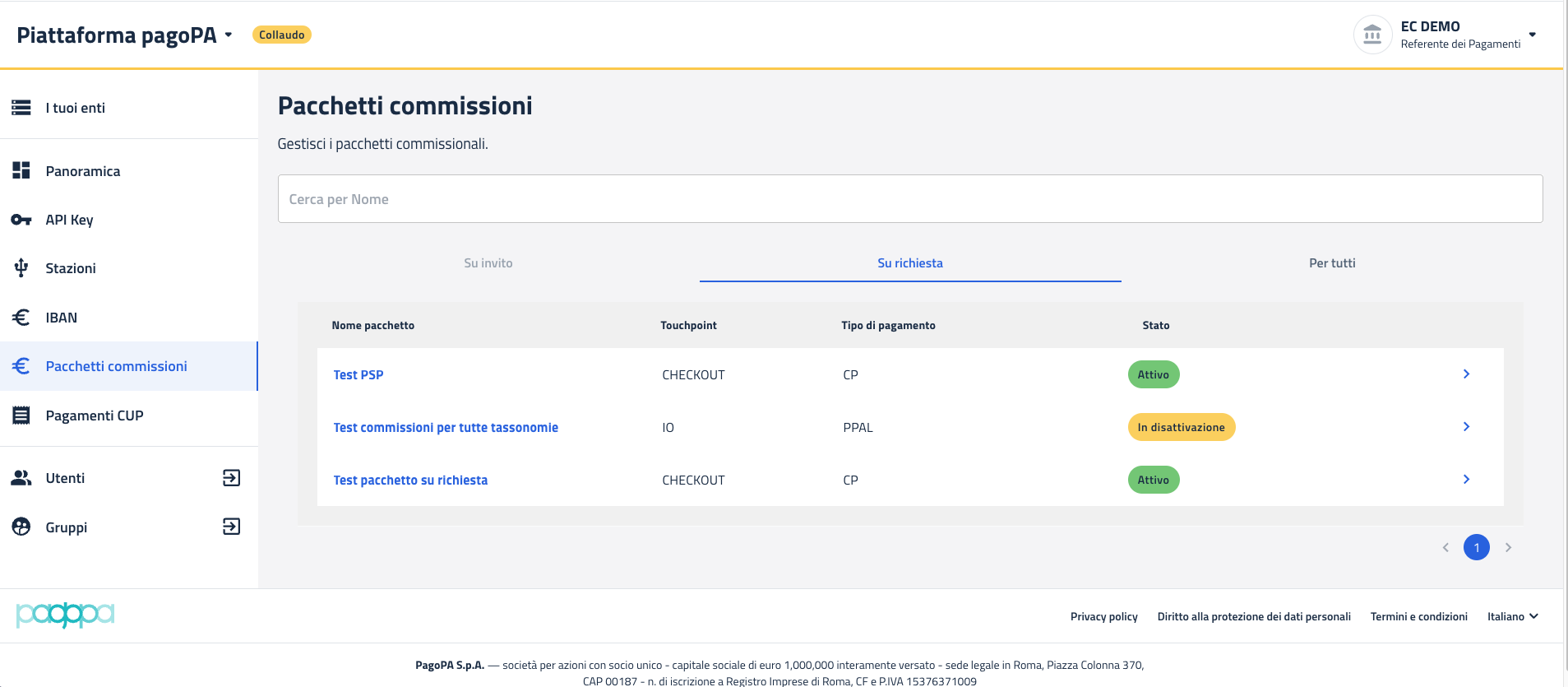 Accedendo alla voce di menù "Pacchetti commissioni" sulla barra laterale di sinistra, si accede alla seguente maschera che mostra l'elenco di tutti i pacchetti "Su richiesta" disponibili.