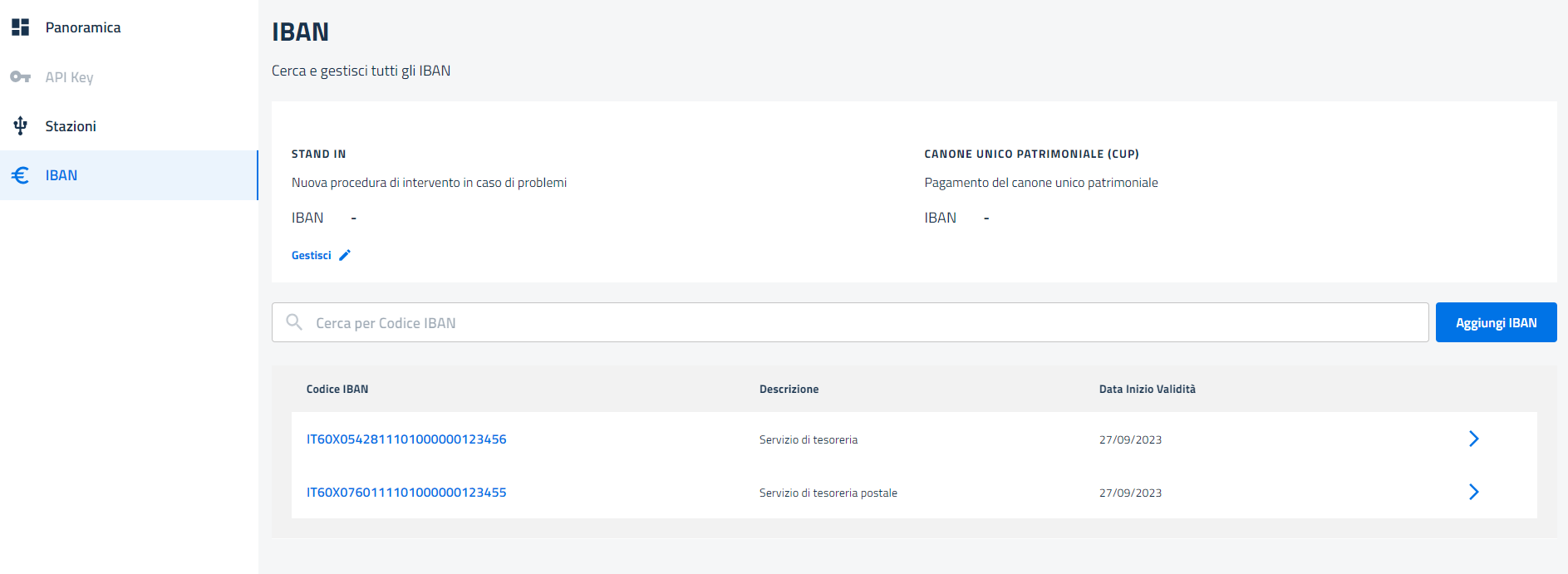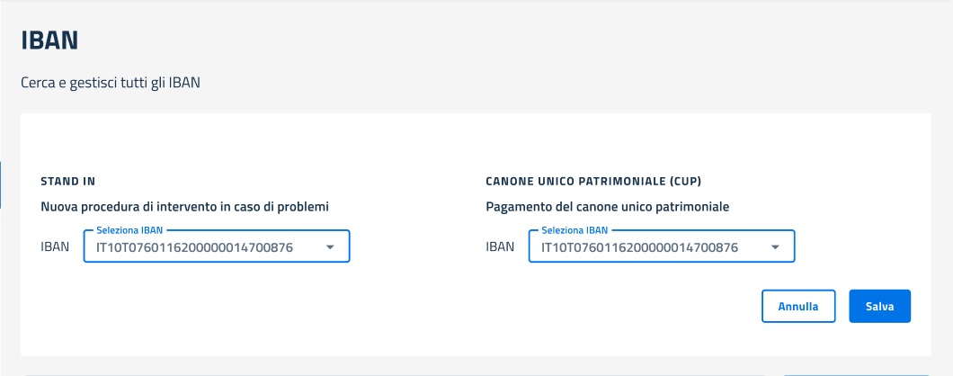 All'interno della sezione IBAN è possibile selezionare gli IBAN designati come Stand In e come Cup selezionandoli tra quelli disponibili dall'apposito menu a tendina presente nel box in alto.