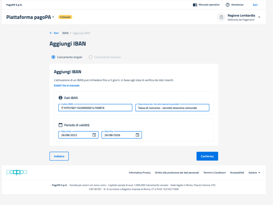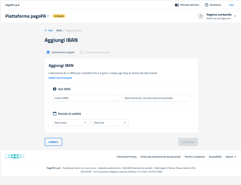 Al click su "Aggiungi IBAN" l'utente può accedere alla pagina Aggiungi IBAN in cui selezionando "Caricamento singolo", è possibile inserire tutti i dati necessari alla configurazione di un singolo IBAN.