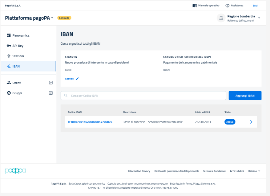 La funzionalità Aggiungi IBAN è riservata esclusivamente al Referente dei Pagamenti.