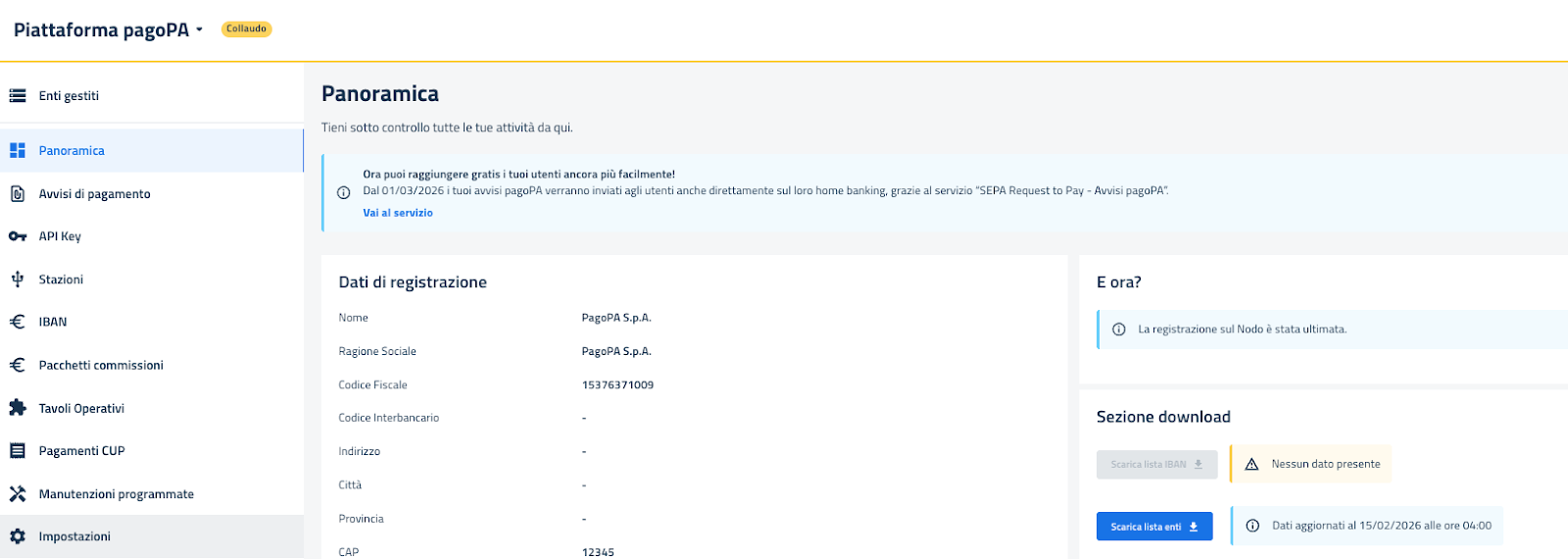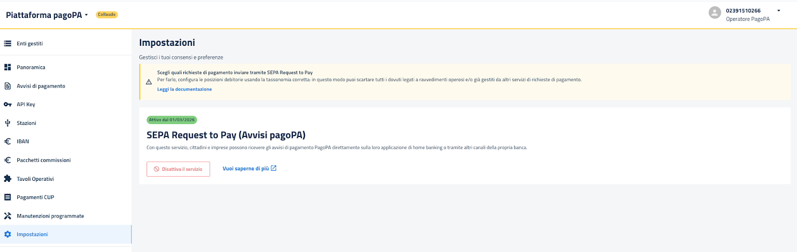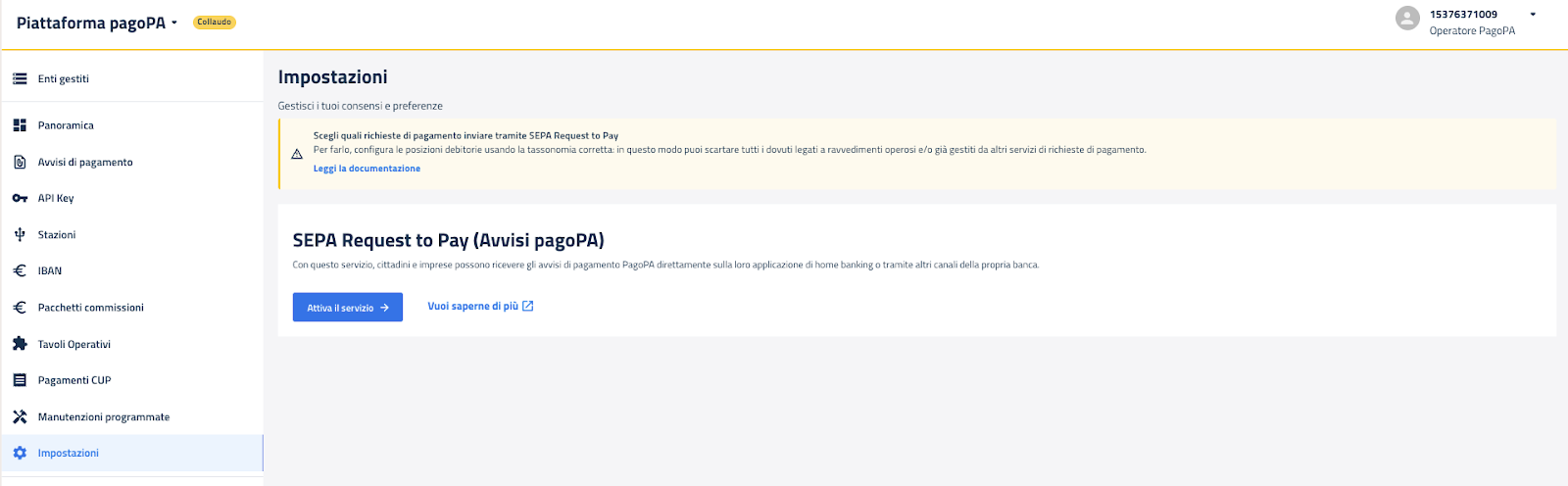 La sezione Request to Pay (RTP) è visibile esclusivamente agli Enti Creditori accreditati all'interno dell’Indice delle Pubbliche Amministrazioni (IPA) e accessibile tramite l’etichetta "Impostazioni".