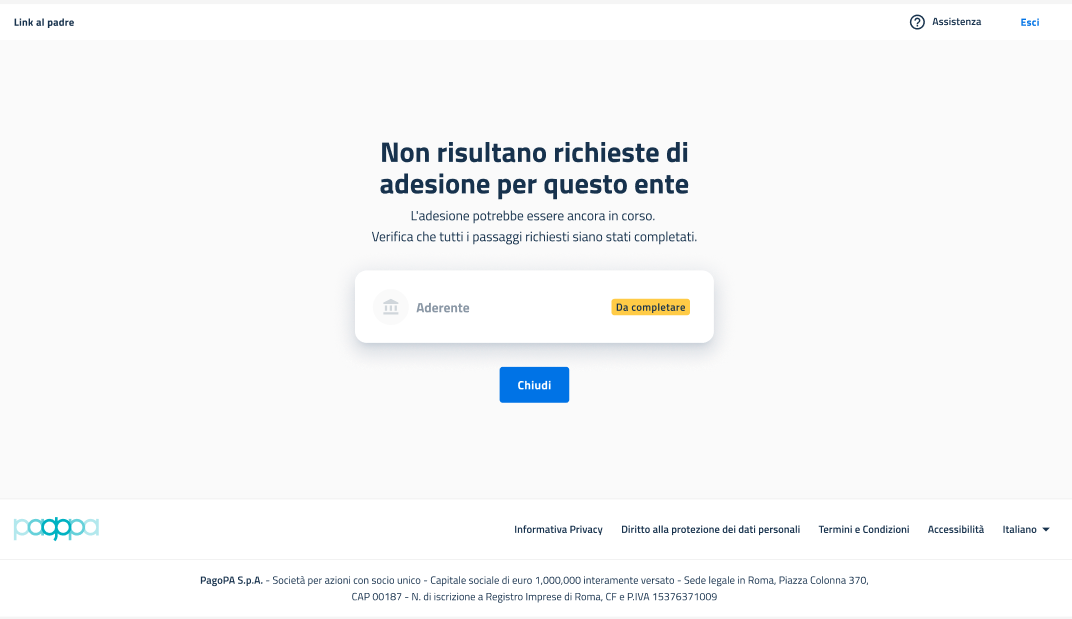 Se l'unico aderente a cui si è associati non ha ancora portato a termine l'adesione al primo prodotto, in pagina sarà mostrata l'etichetta dell'ente con le seguenti informazioni: