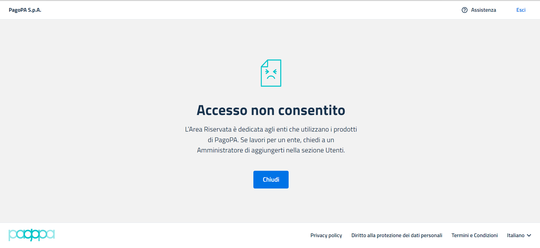 Da qui sarà solo possibile tornare alla schermata di login tramite il tasto "Chiudi", effettuare il log-out oppure contattare l'Assistenza.