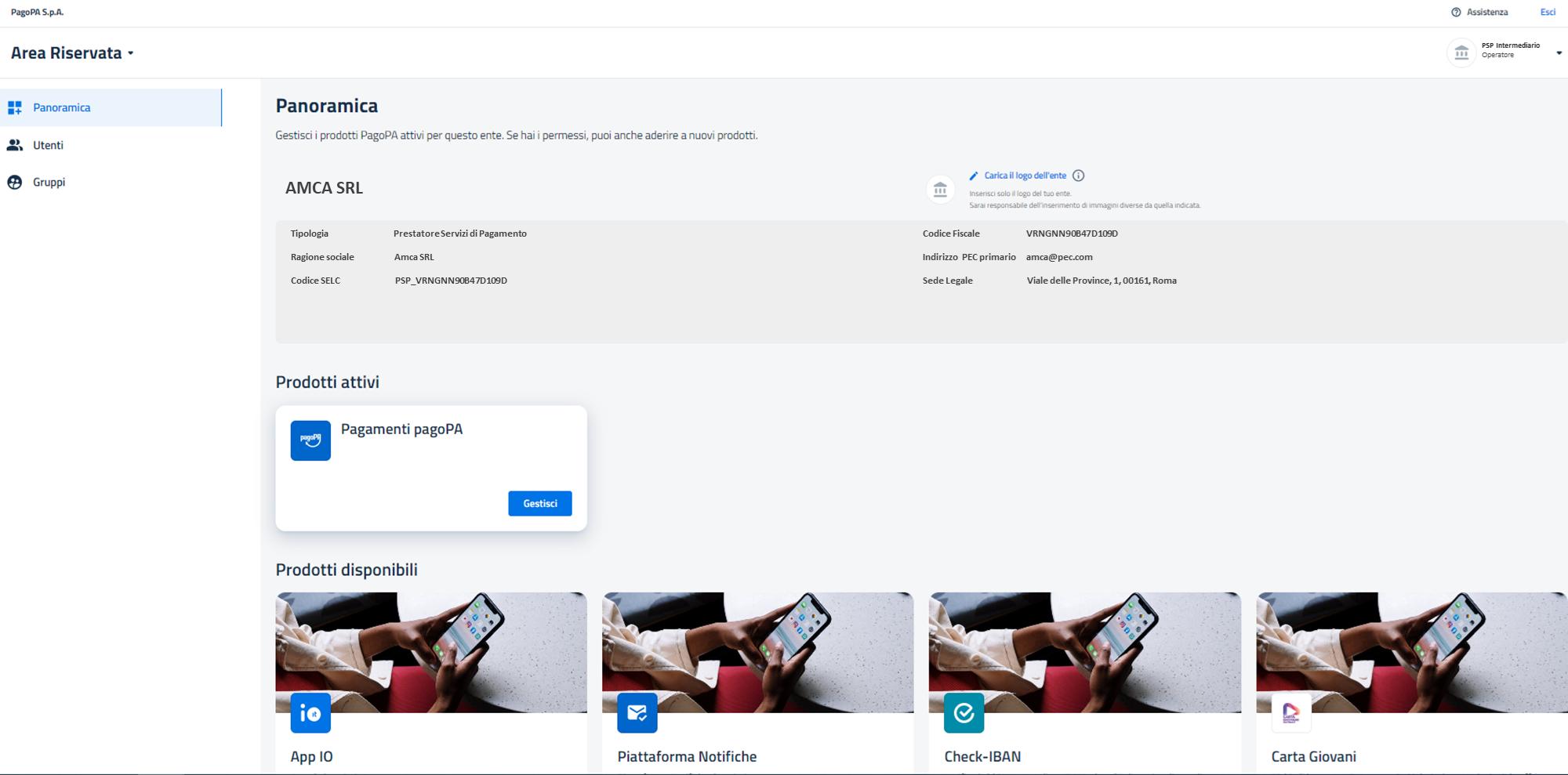 Questa sezione ospita la lista dei prodotti a cui il PSP ha aderito e da cui è possibile effettuare l'accesso al portale dedicato al singolo prodotto.