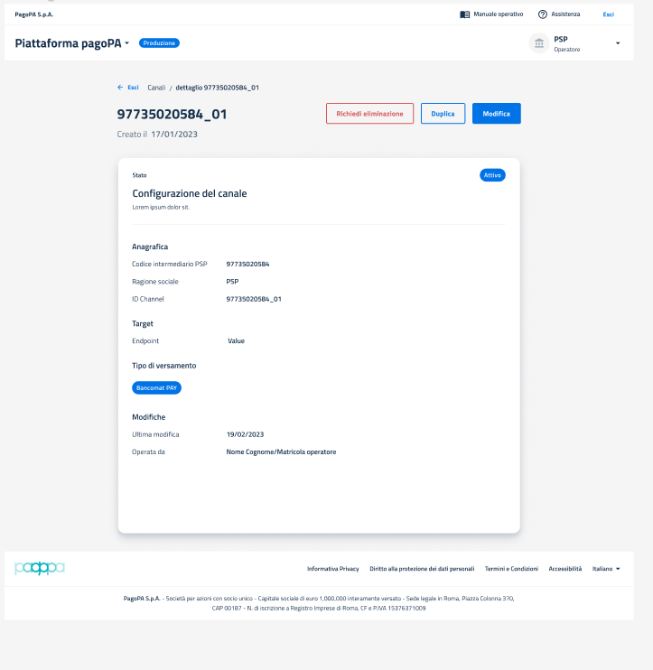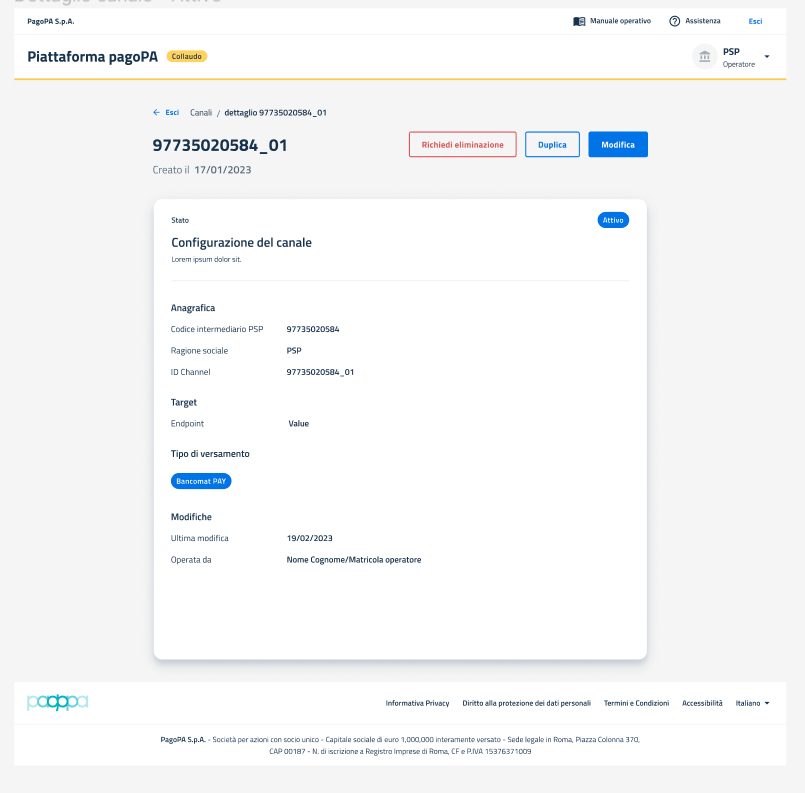 Da questa pagina, oltre alla mera consultazione ha la possibilità di avviare le azioni di disabilitazione, duplicazione e modifica del canale cliccando sui rispettivi tasti "Richiedi eliminazione", "Duplica" e "Modifica".