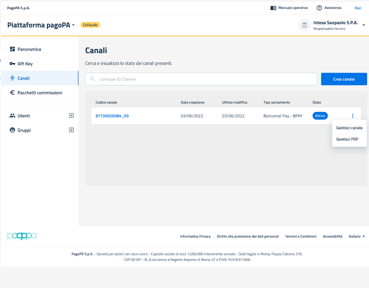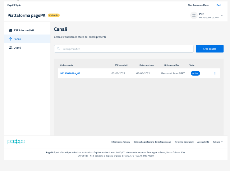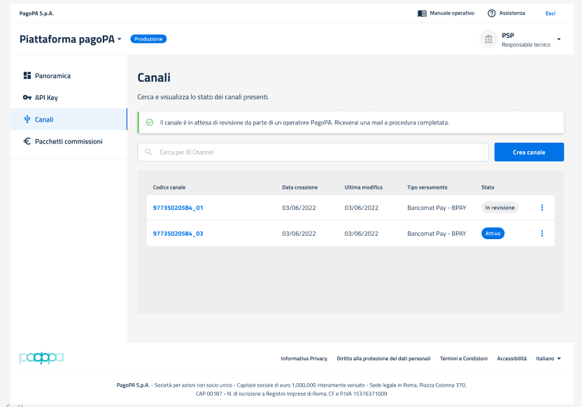 Nella Pagina "Vista Canali", dopo aver effettuato la creazione del canale in ambiente di collaudo, l'utente può visualizzare l'elenco dei canali creati sotto forma di tabella in Stato Attivo.