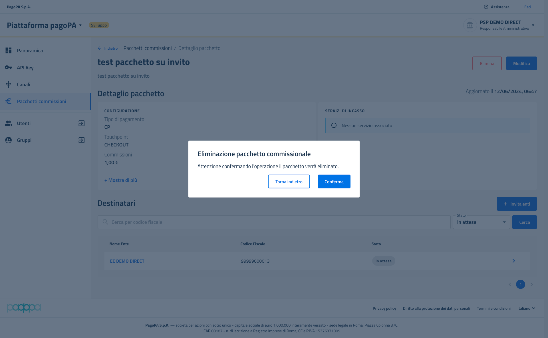 Alla pressione del tasto "Conferma" la cancellazione del pacchetto viene richiesta.