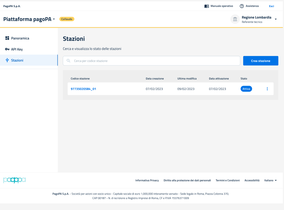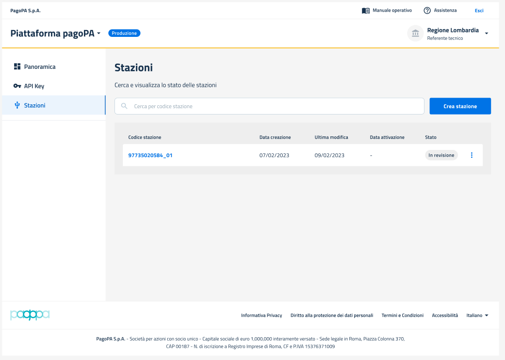 • Stato: che mostra il dettaglio sullo stato di avanzamento del processo di creazione della stazione e può assumere il valore: "In revisione": la stazione è stata creata, ma in attesa di revisione da parte di PagoPA); "Da correggere": la stazione è stata revisionata e richiede delle correzioni; "Attivo" (la stazione è correttamente in esercizio).