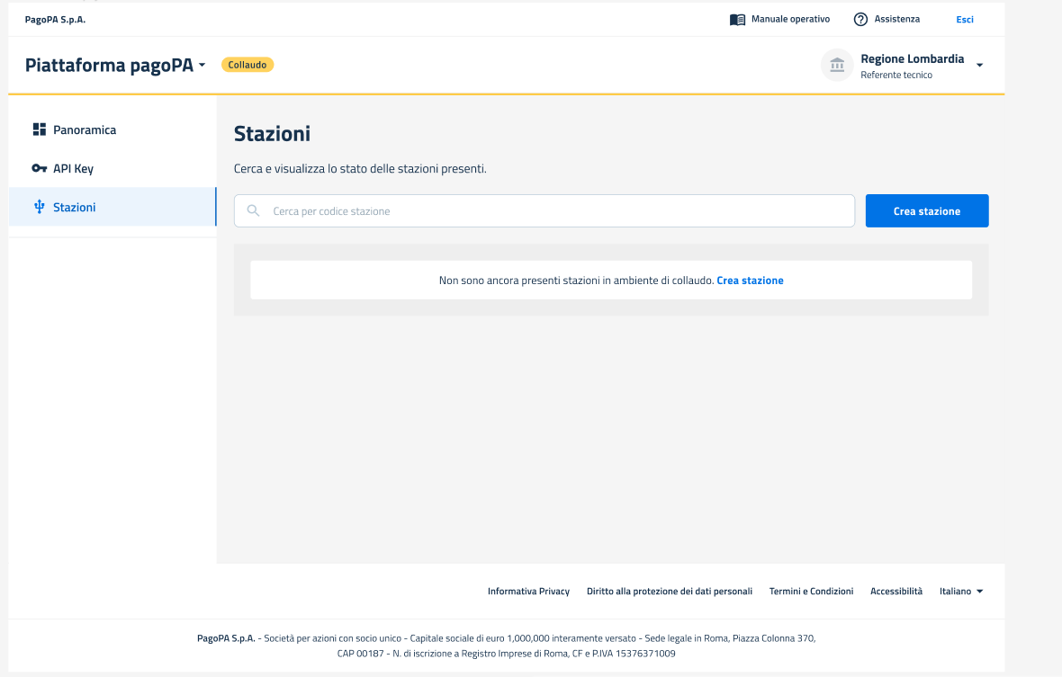 All'interno del Back office pagoPA in ambiente di collaudo, è possibile accedere alla sezione Stazioni cliccando sulla voce di menu "Stazioni".
