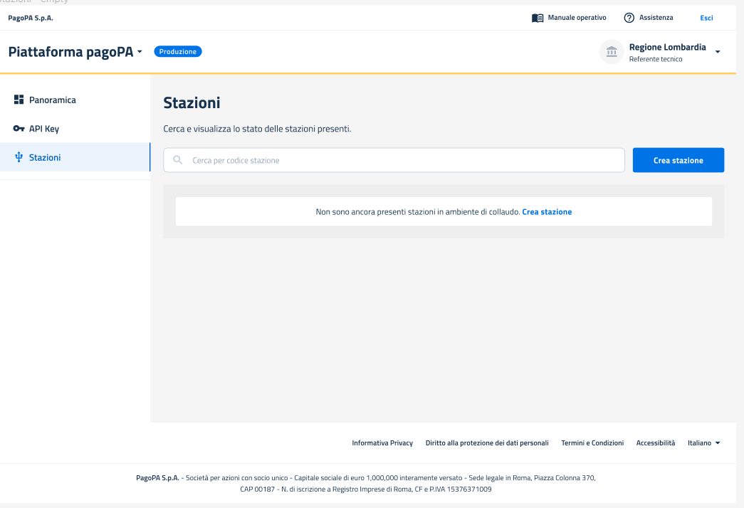 All'interno del Back office pagoPA in ambiente di produzione, è possibile accedere alla sezione Stazioni cliccando sulla voce di menu "Stazioni".