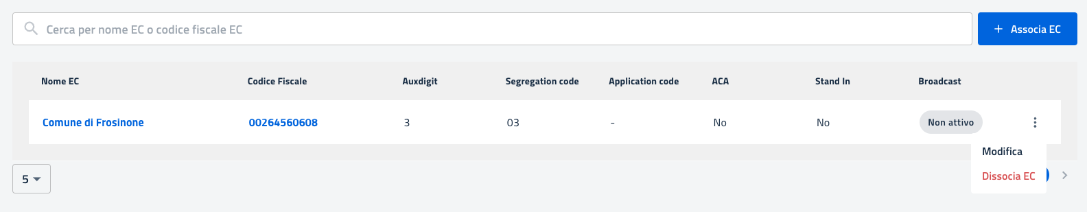 Una volta completati tutti i campi l'utente potrà finalizzare l'operazione cliccando sul tasto "Conferma" abilitato e verrà reindirizzato alla pagina "Gestisci EC" in cui visualizzerà nell'apposita tabella l'EC appena associato.