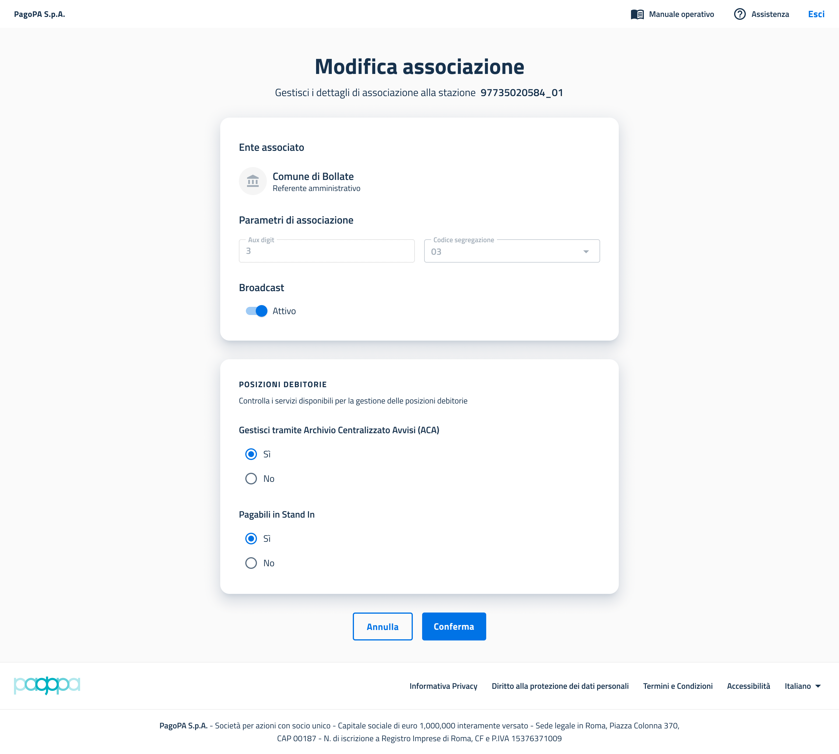 - Flag Archivio Centralizzato Avvisi: campo SI / NO (default SI) che serve a specificare se l'ente può inviare le posizioni debitorie nell'ACA per permettere la continuità operativa (StandIN) in caso di malfunzionamenti della stazione. Si ricorda infatti che nel caso in cui i dati NON siano dall’EC comunicati ad ACA lo Stand In non potrà essere attivato. Pertanto, all'EC viene addebitato un importo fisso di 5 centesimi per ciascun pagamento, funzionale alla gestione del processo fuori da Stand In.Ai fini della fatturazione dello Stand In vale l’anagrafica delle EC fornita in sede di adesione alla piattaforma pagoPA ovvero quella risultante alla data del 1 gennaio 2025 in caso di aggiornamento della stessa anagrafica da parte dell’Ente antecedentemente a tale data.maggiori info in https://docs.pagopa.it/sanp/ente-creditore/modalita-dintegrazione/integrazione-tramite-api-sincrone#archivio-centralizzato-avvisi e https://docs.pagopa.it/sanp/specifiche-attuative-del-nodo-dei-pagamenti-spc/funzionamento-generale/stand-in