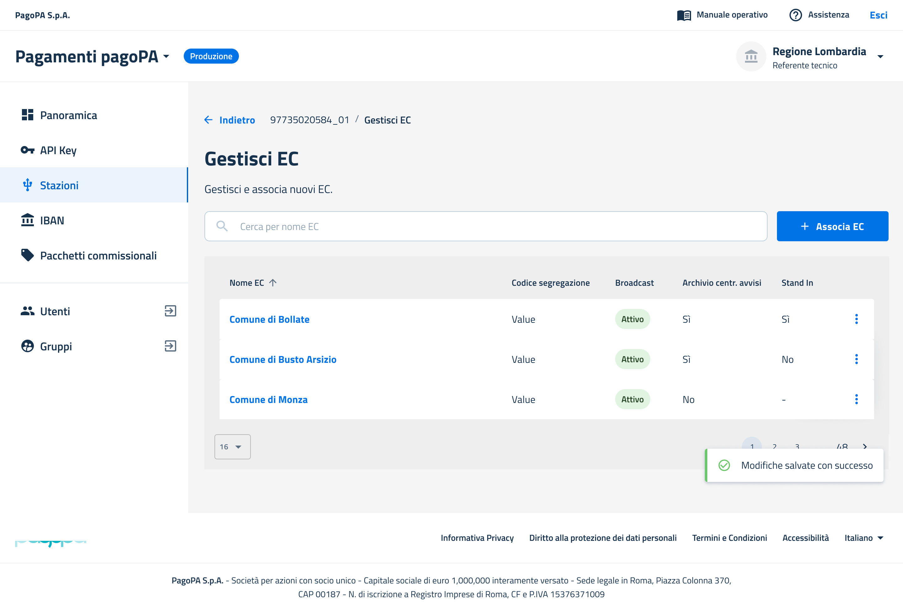 Una volta aver cliccato su "Conferma" l'utente verrà reindirizzato alla pagina "Gestisci EC" e visualizzerà la notifica di conferma "Operazione completata con successo".