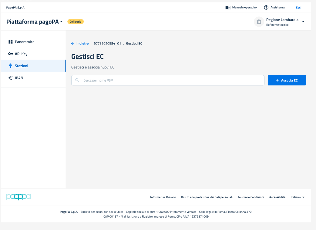 Selezionando la voce "Gestisci EC", l'utente può accedere alla Pagina "Gestione EC". Tale Pagina è vuota nel caso in cui il PT non ha ancora associato alcun EC a quella stazione.