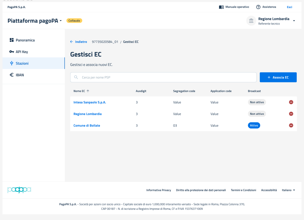 Questa funzionalità consente al PT di associare alla propria stazione un ente che ne abbia fatto richiesta. Tramite tale stazione, l'ente potrà connettersi al Nodo dei Pagamenti PagoPA.