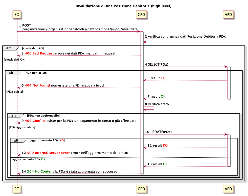 L'invalidazione di una posizione debitore consiste di fatto in una cancellazione logica. E' possibile effettuarla solo se la posizione debitoria da invalidare si trova negli stati PUBLISHED e VALID. La funzionalità è utile quando si vuole dare evidenza all'utente, in fase di pagamento, della invalidazione della posizione debitoria. Nel caso in cui allo IUPD indicato nella richiesta non corrisponda una posizione debitoria appartenente all'EC richiedente, la richiesta restituisce un errore.