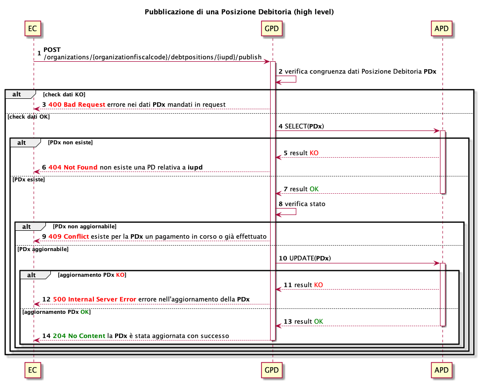 La pubblicazione della posizione debitoria permette il passaggio dallo stato DRAFT allo stato PUBLISHED. Una posizione in stato DRAFT (bozza), infatti, non permette la normale operatività con la piattaforma pagoPA. Solo quando l'Ente Creditore pubblica la posizione, in coerenza con le date di validità e di scadenza, questa risulta pagabile sulla piattaforma. Nel caso in cui allo IUPD indicato nella richiesta non corrisponda una posizione debitoria in stato DRAFT appartenente all'EC richiedente, la richiesta restituisce un errore.