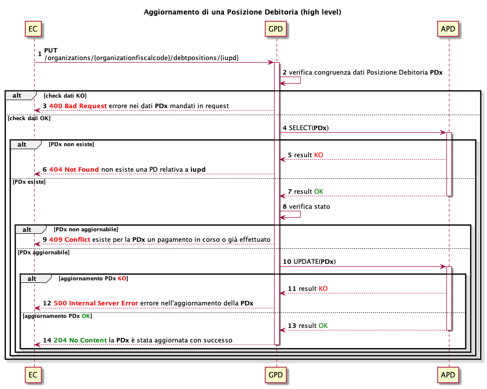 In fase di aggiornamento, oltre ai già citati controlli in fase di creazione, si verifica, inoltre, che la posizione sia esistente ed aggiornabile. In particolare, l'aggiornabilità della posizione debitoria dipende dallo stato della posizione stessa. Ad esempio, se una posizione debitoria è già stata pagata, interamente o parzialmente, oppure rendicontata oppure invalidata non sarà possibile aggiornarla e verrà restituito un errore.