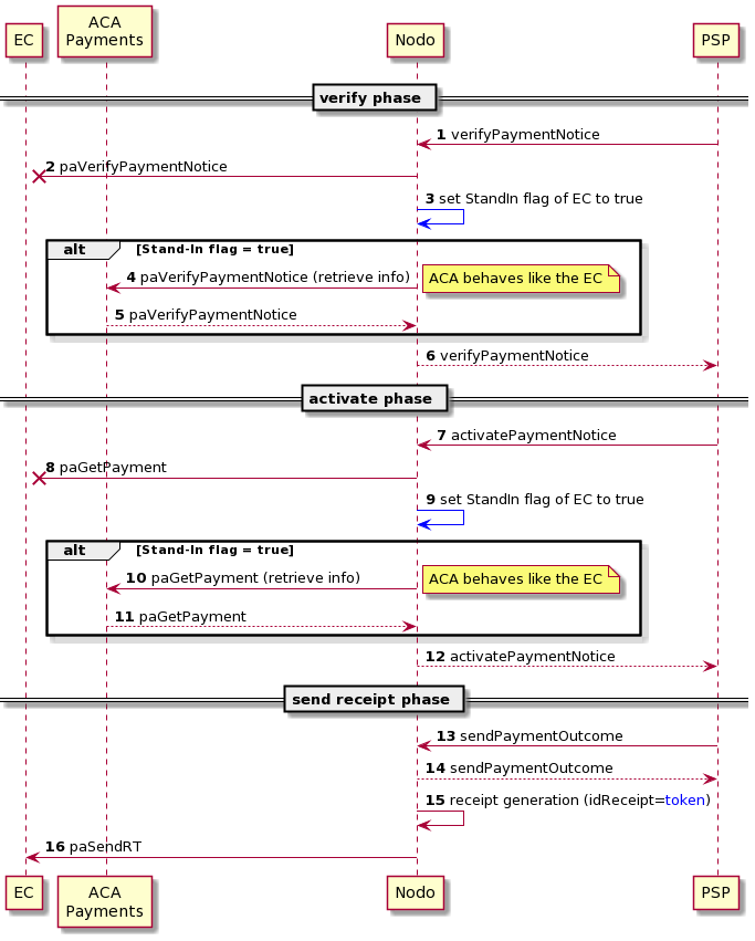 In caso l'EC non risponda all’invocazione delle citate primitive entro il tempo massimo previsto, così come indicato in Livelli di Servizio PSP, la piattaforma attiva automaticamente la funzionalità di Stand In, successivamente il NodoSPC verifica la presenza dell'avviso di pagamento in ACA.