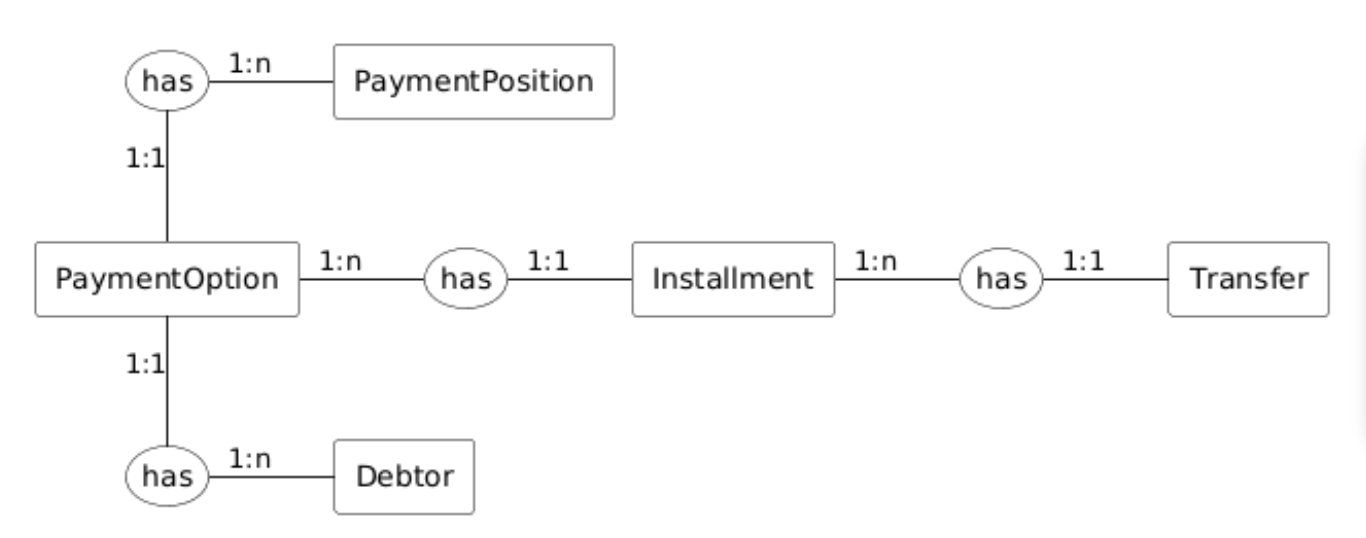 • Una Payment Position può avere più Payment Option. Ne esiste almeno una. Una Payment Option è collegata ad una sola Payment Position.