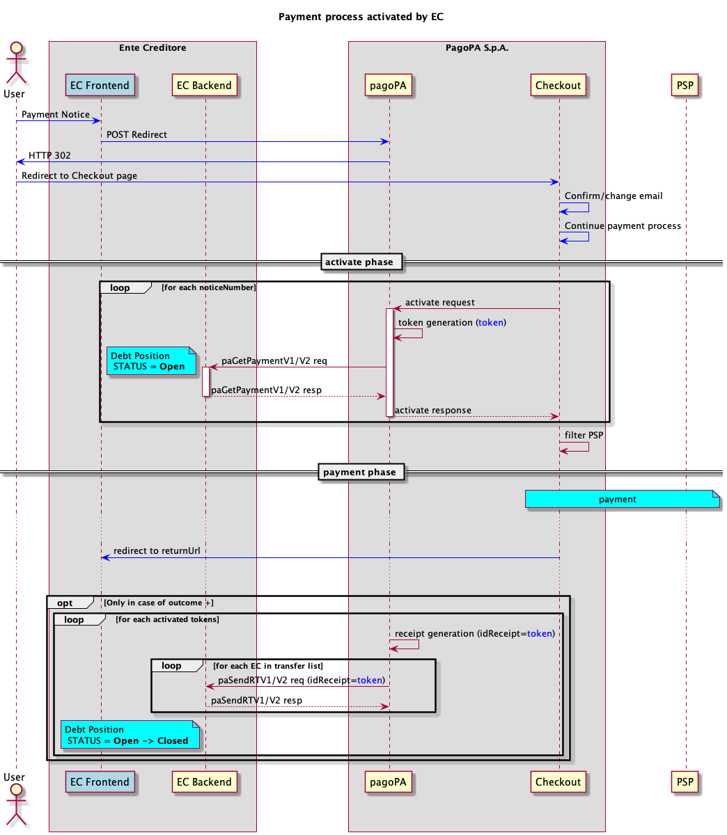 L'integrazione del frontend dell'EC con la piattaforma pagoPA avviene per mezzo di Checkout, un’applicazione web che consente ad un utente la navigazione degli strumenti di pagamento resi disponibili dai PSP aderenti alla piattaforma pagoPA.