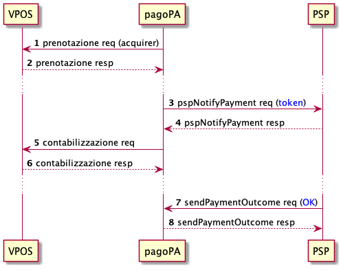 - nel caso di risposta positiva, la piattaforma notifica al PSP associato all’acquirer selezionato che l’autorizzazione è avvenuta con successo, utilizzando la primitiva pspNotifyPayment: