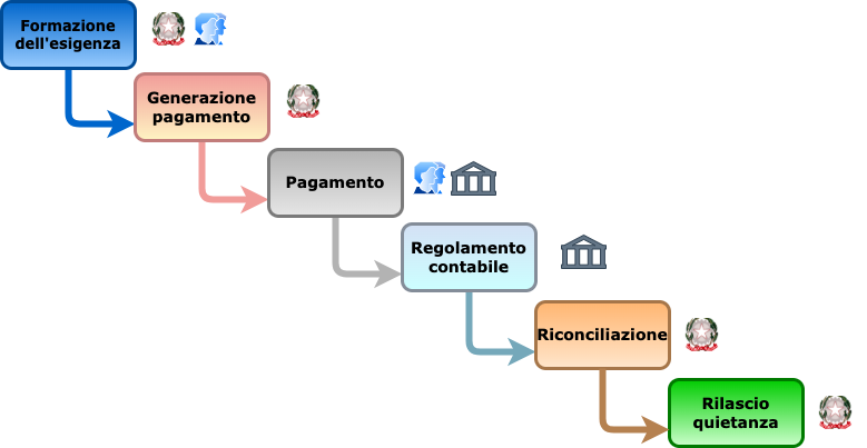 Il pagamento mediante la piattaforma pagoPA è un’operazione complessa, composta di diverse fasi, che, in linea generale, seguono un preordinato “Ciclo di vita” condizionato da procedimenti amministrativi che prevedono il rispetto di regole per il loro corretto svolgimento, tale “Ciclo di vita” può essere rappresentato dal flusso contenuto nella figura seguente.