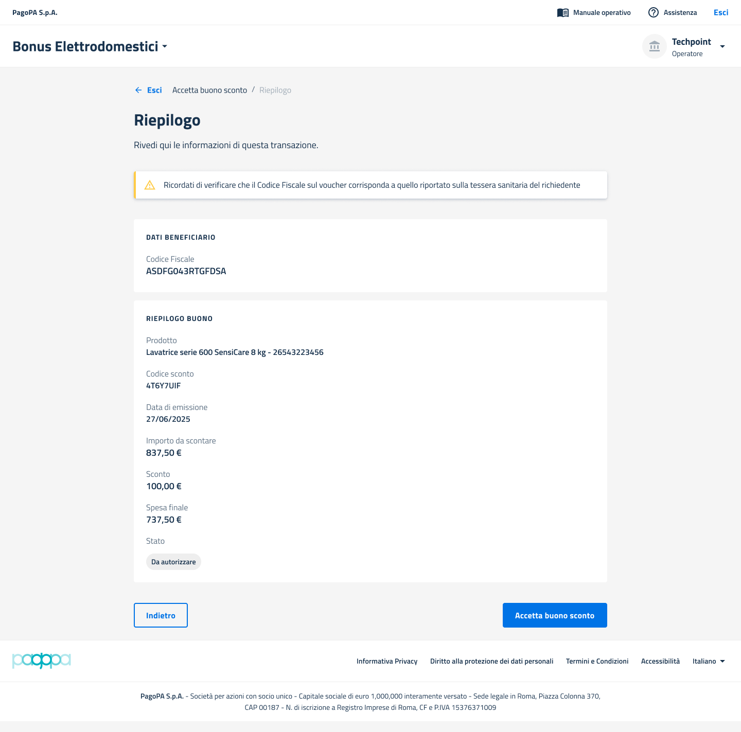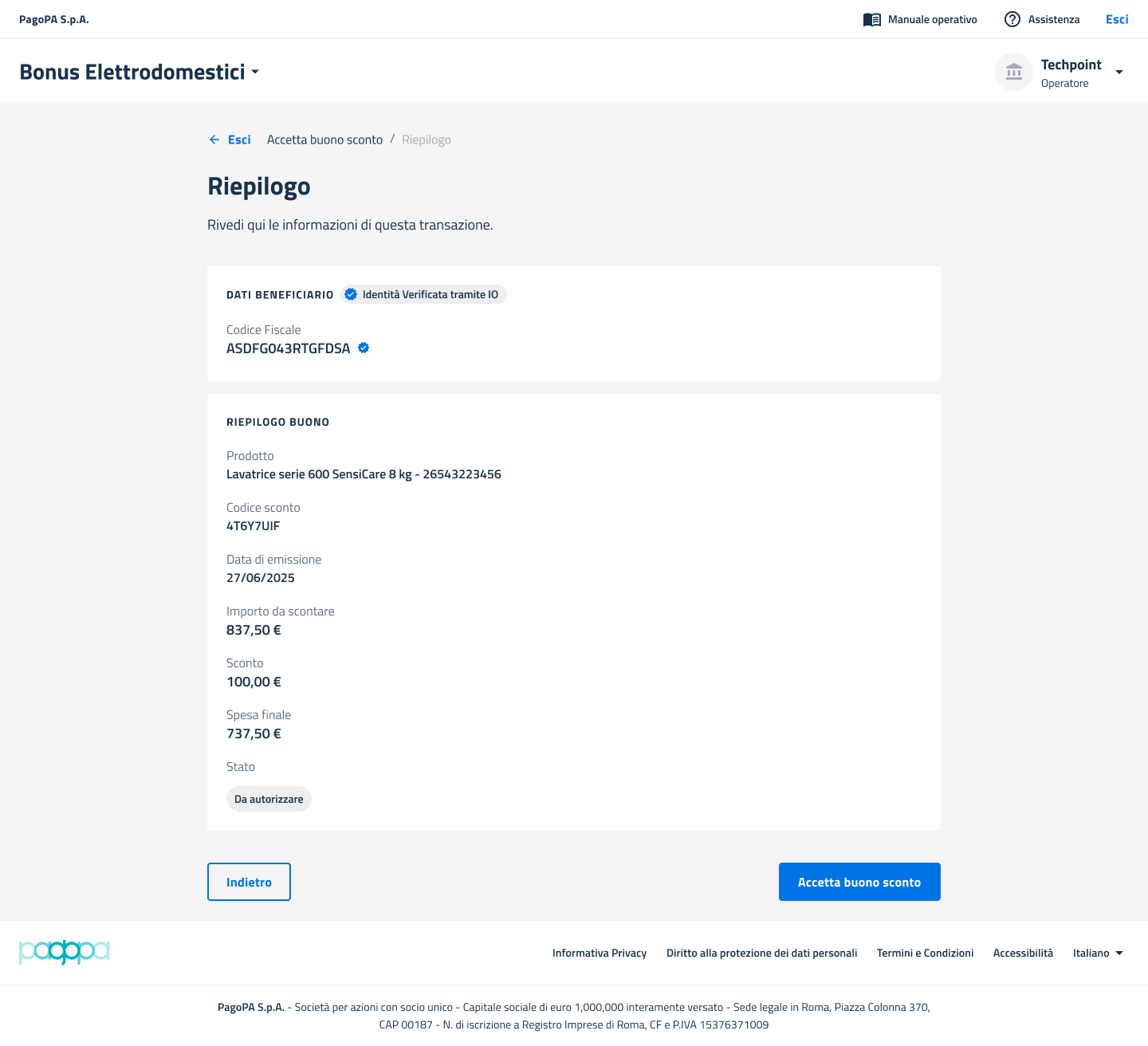 - se tutti i dati sono corretti, l'Operatore deve cliccare sul pulsante "Accetta buono sconto".