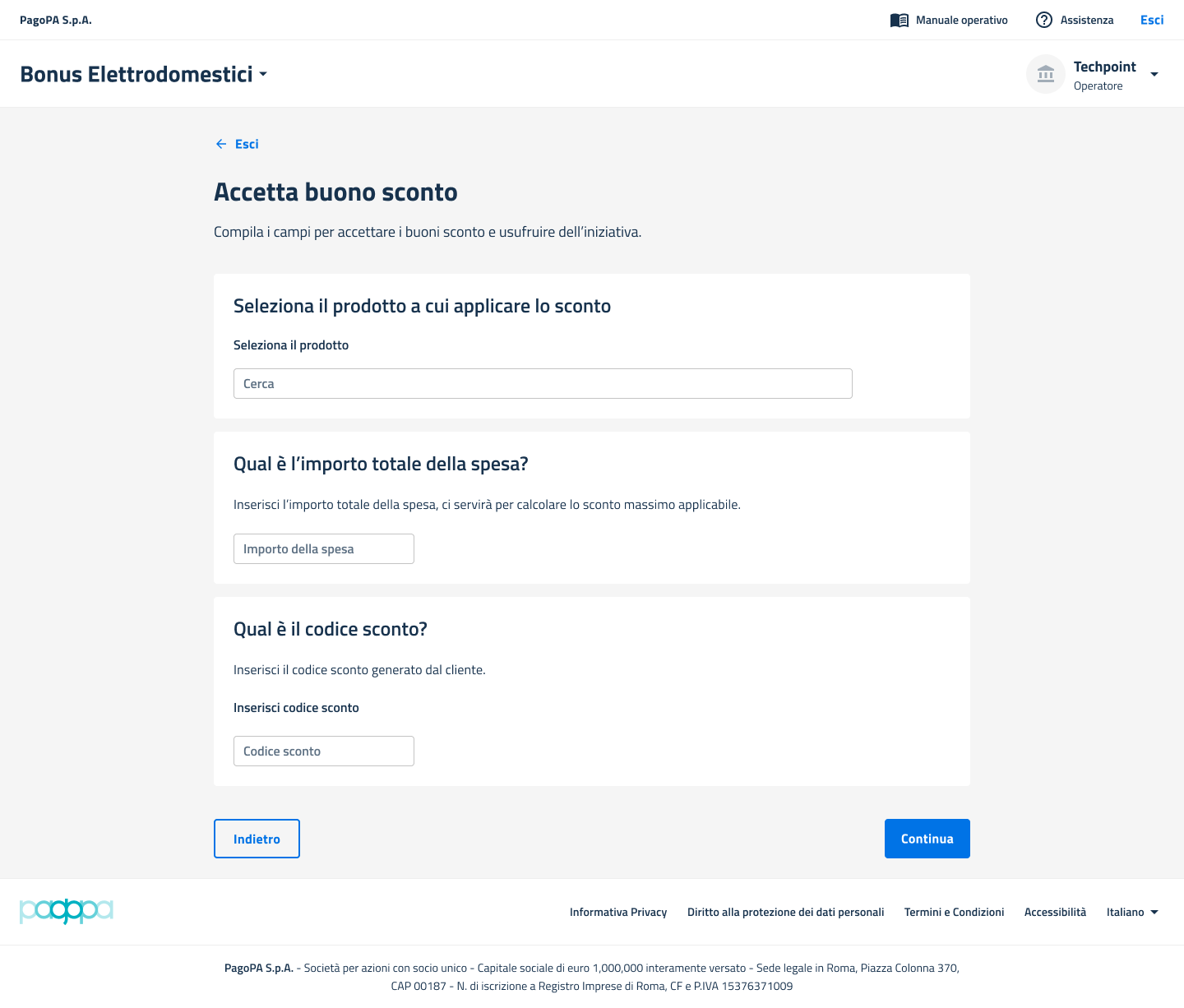 Questa è la procedura operativa principale per l'Operatore Punto Vendita (PV). La guida descrive come inserire il codice sconto presentato da un cittadino.