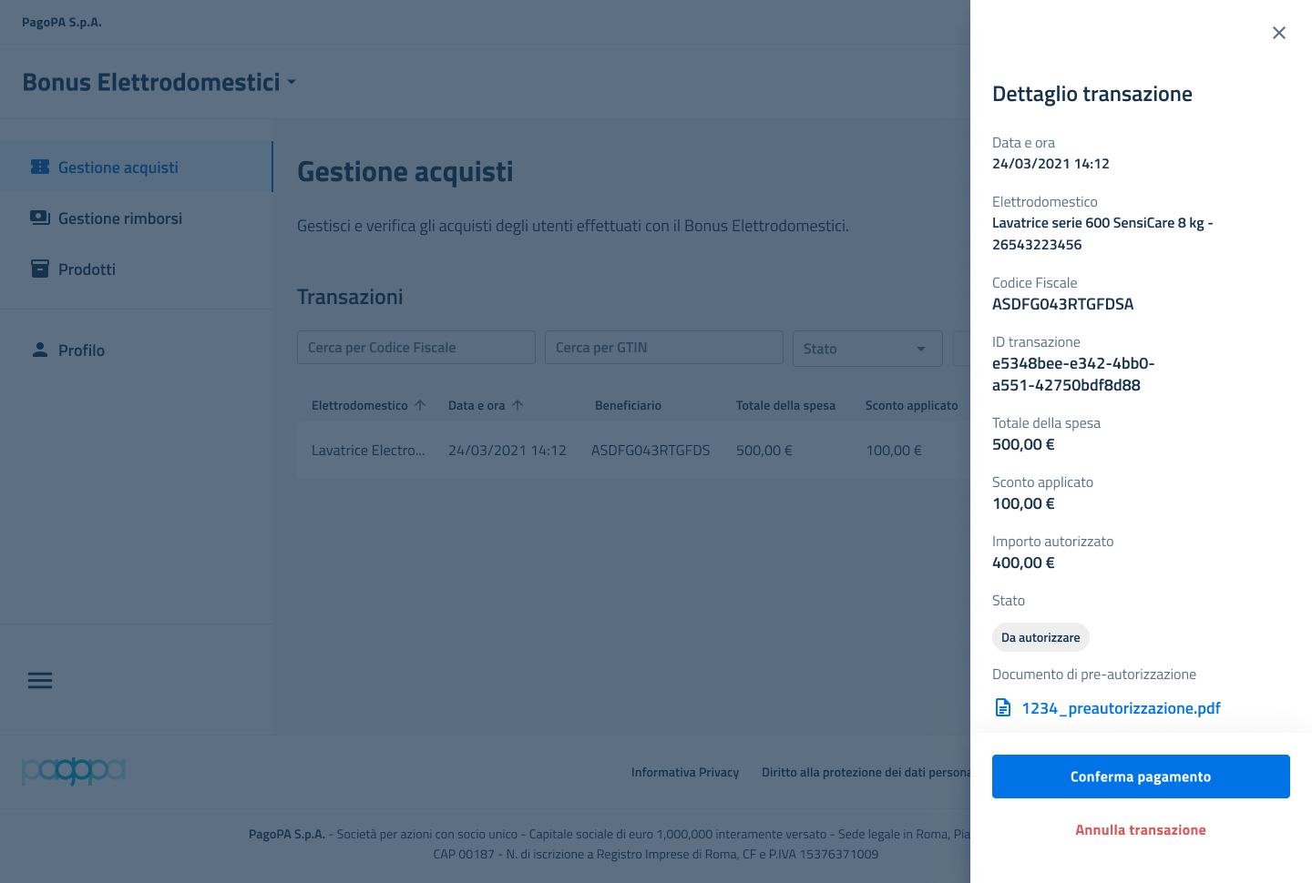 Dopo aver cliccato "Accetta buono sconto", la transazione verrà mostrata nell'elenco della sezione "Gestione acquisti" nello stato "Da autorizzare".