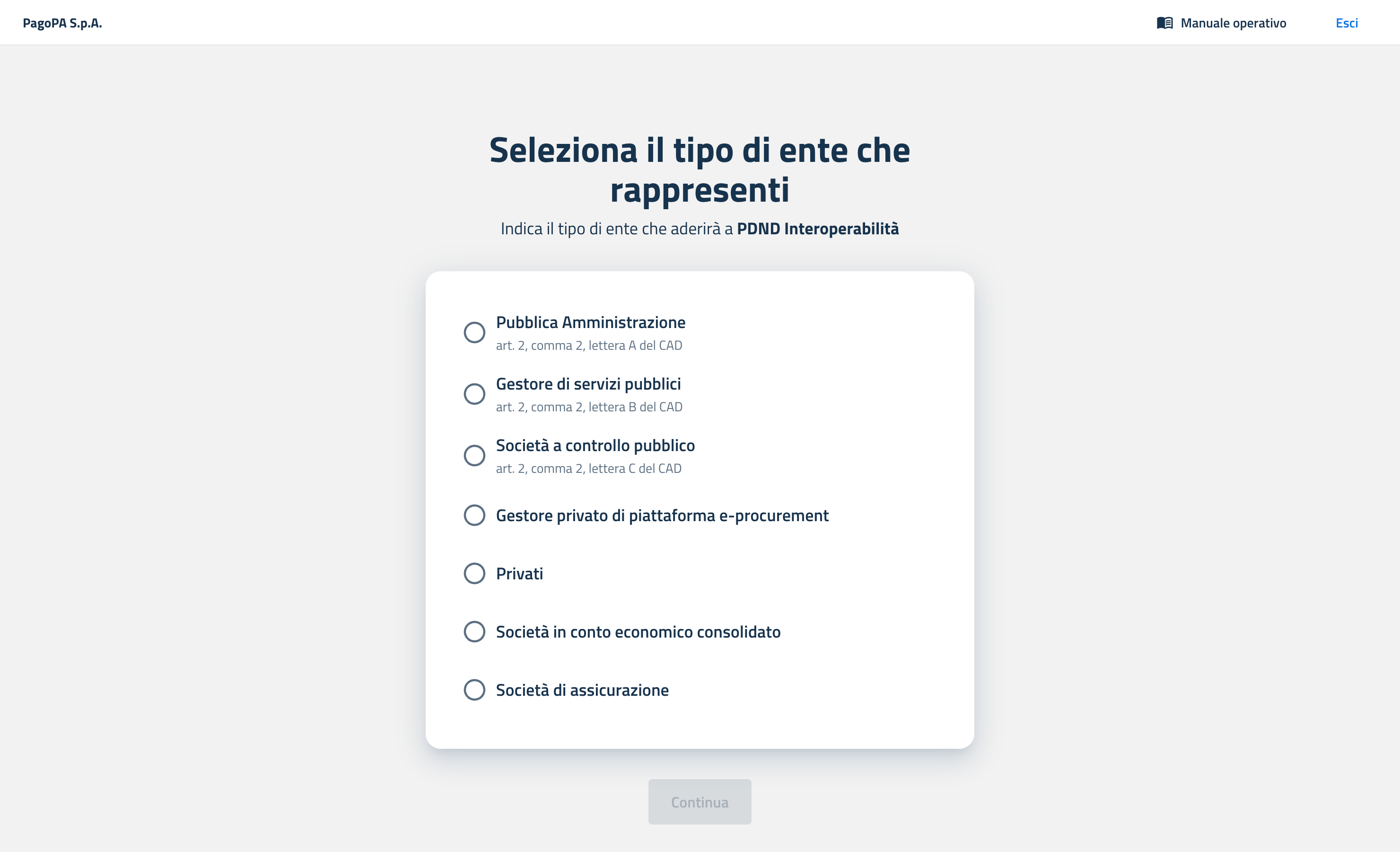 Seleziona la tipologia dell’ente per cui stai operando, ai sensi degli artt. 2, comma 2, e 64-bis, comma 6, del Codice dell’Amministrazione Digitale (CAD).