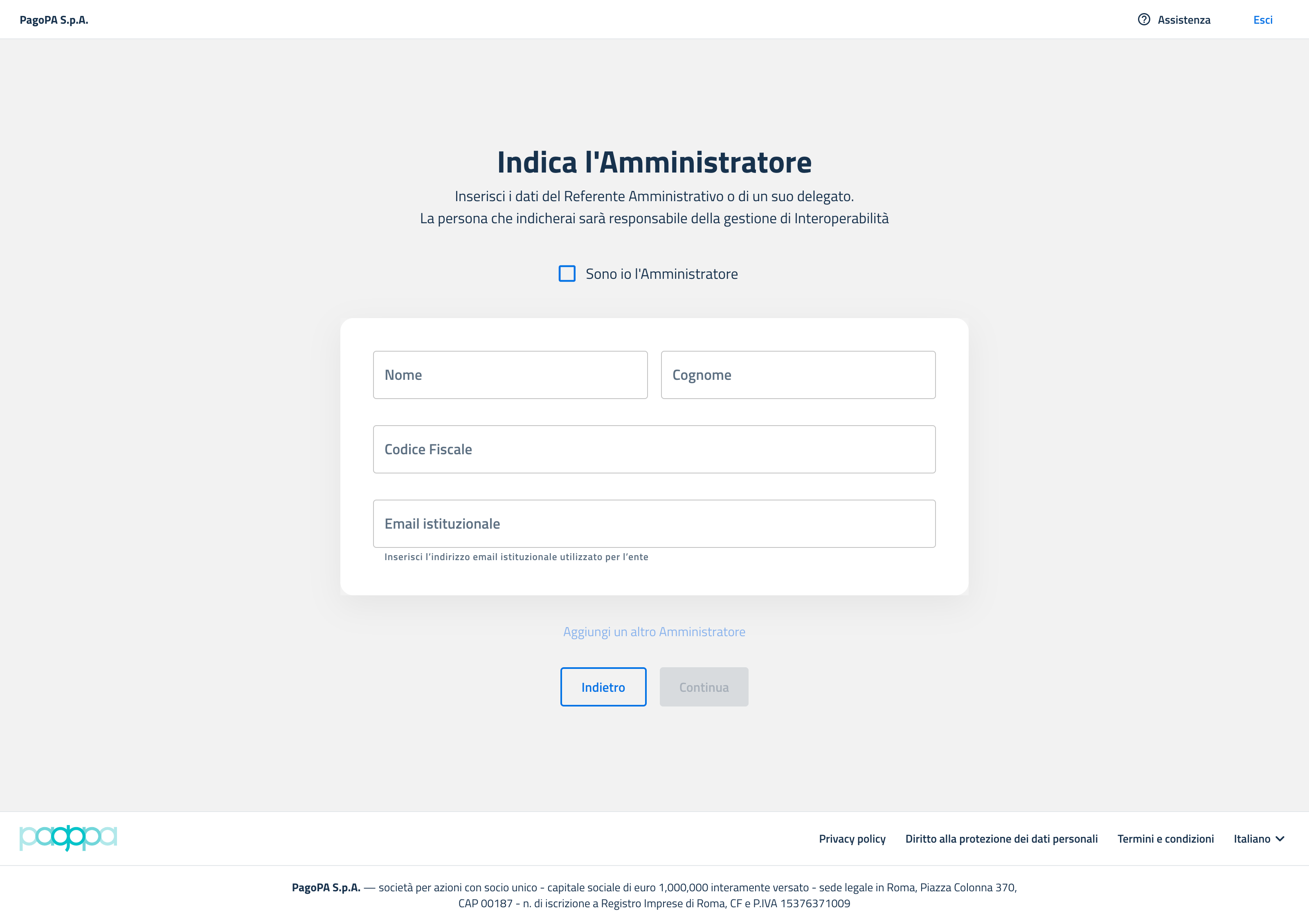 Il passo successivo consiste nella nomina di uno o più Amministratori. Queste figure saranno gli utenti principali del back-office di Interoperabilità e avranno il compito di gestire la piattaforma per conto dell'ente.