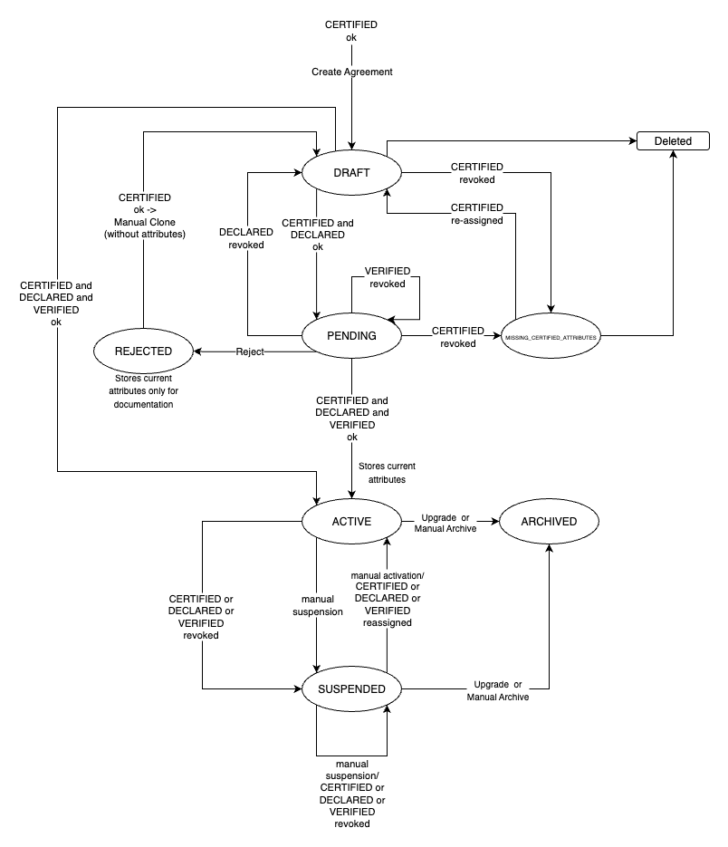 | DRAFT | Stato iniziale alla creazione dell’Agreement; richiede attributi CERTIFIED soddisfatti (se previsti). | → ACTIVE (tutti i requisiti soddisfatti); → PENDING (richiede validazioni dell’erogatore); → MISSING_CERTIFIED_ATTRIBUTES (perdita di un CERTIFIED); → cancellazione. |